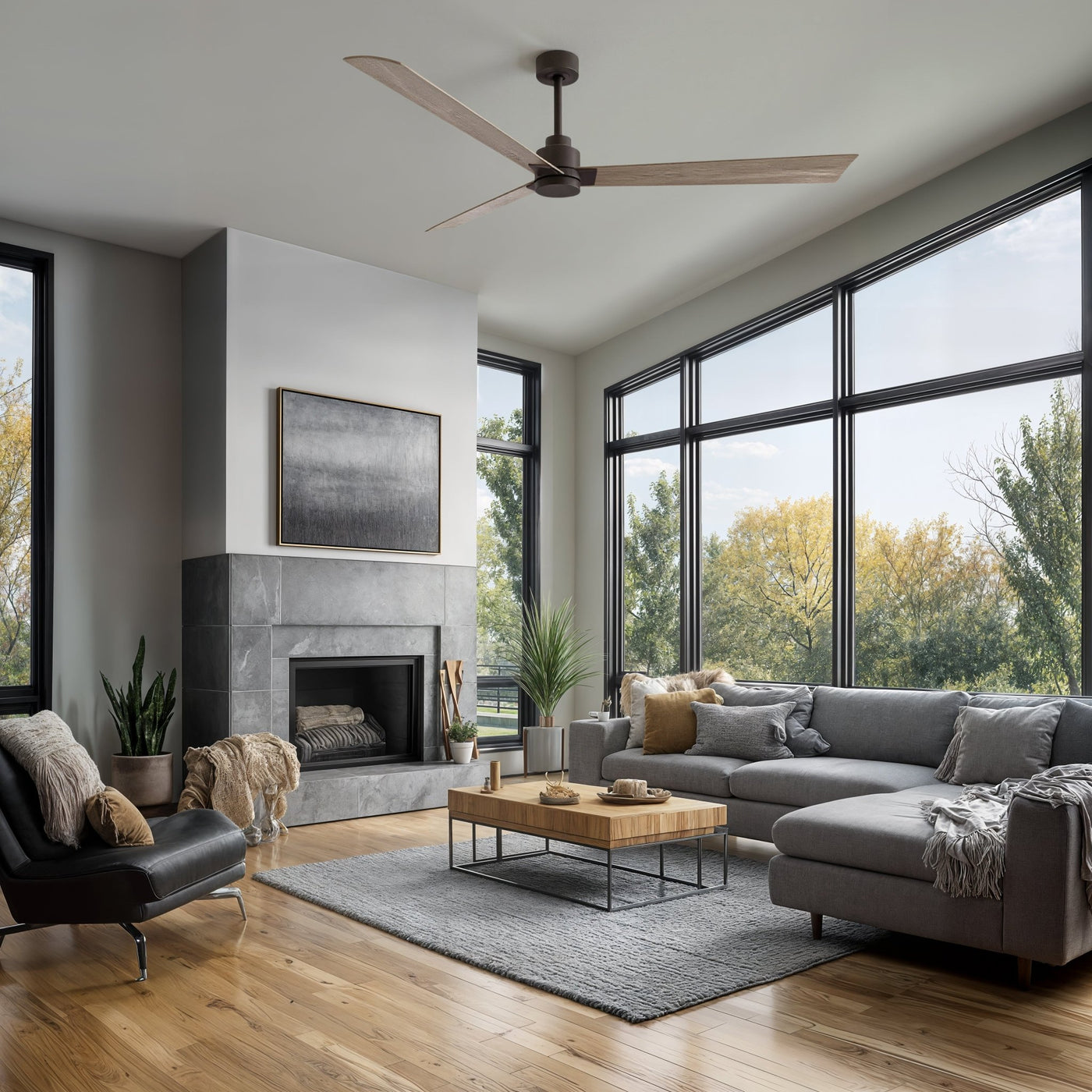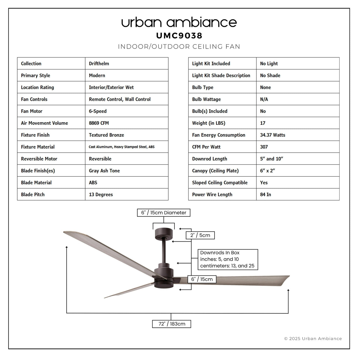 UMC9038 Modern Indoor/Outdoor Ceiling Fan, 8" (Plus Downrod) H x 72" W x 72" D, Textured Bronze Finish, Drifthelm Collection