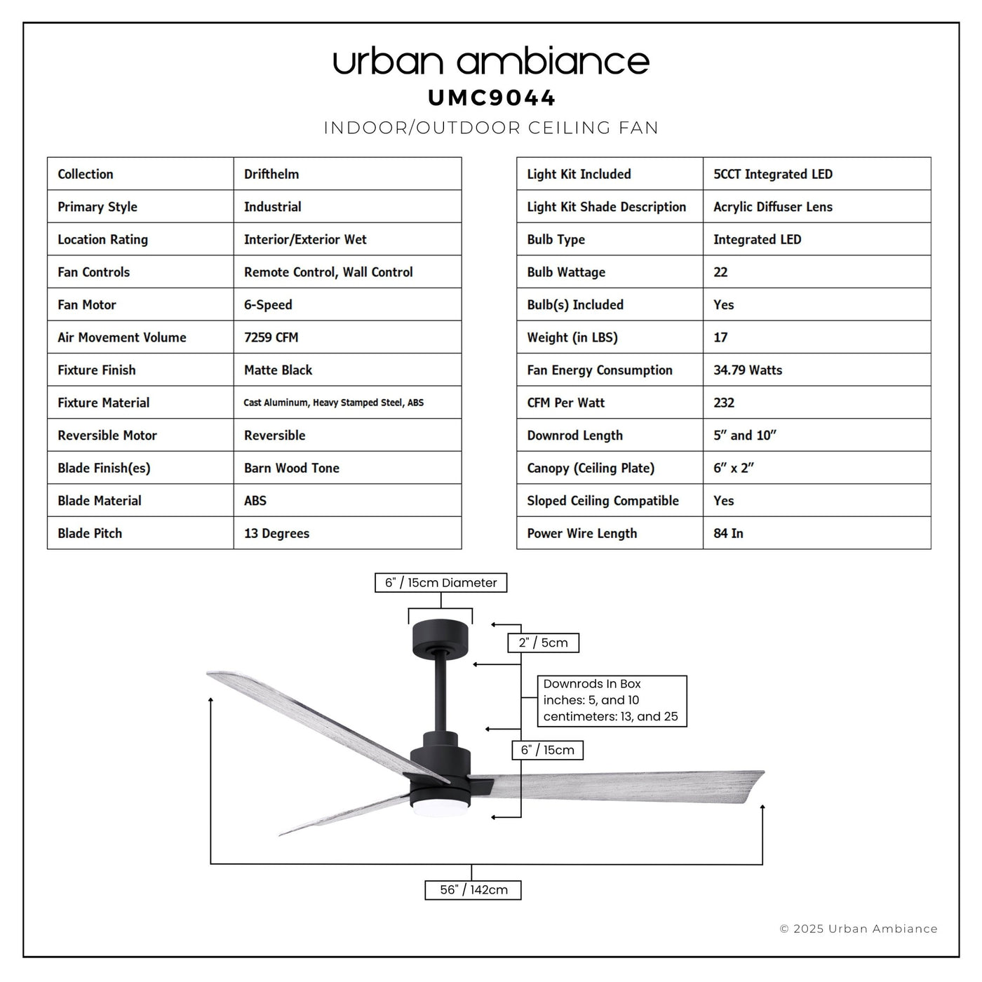UMC9044 Industrial Indoor/Outdoor Ceiling Fan, 8" (Plus Downrod) H x 56" W x 56" D, Matte Black Finish, Drifthelm Collection
