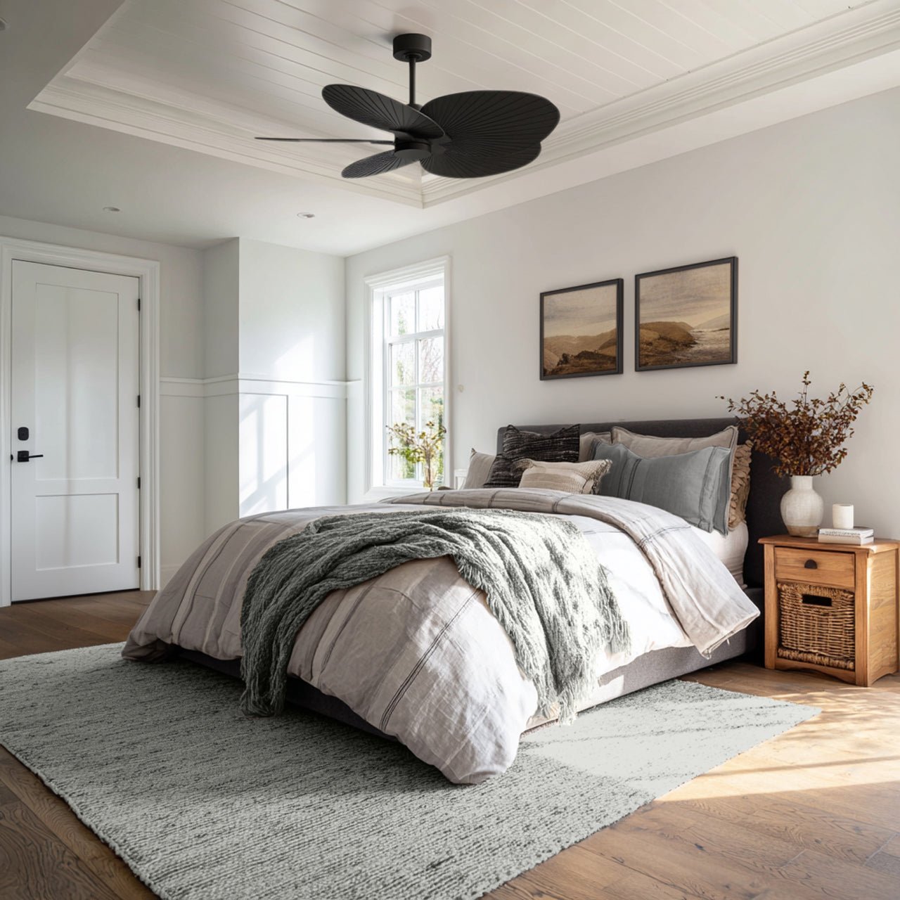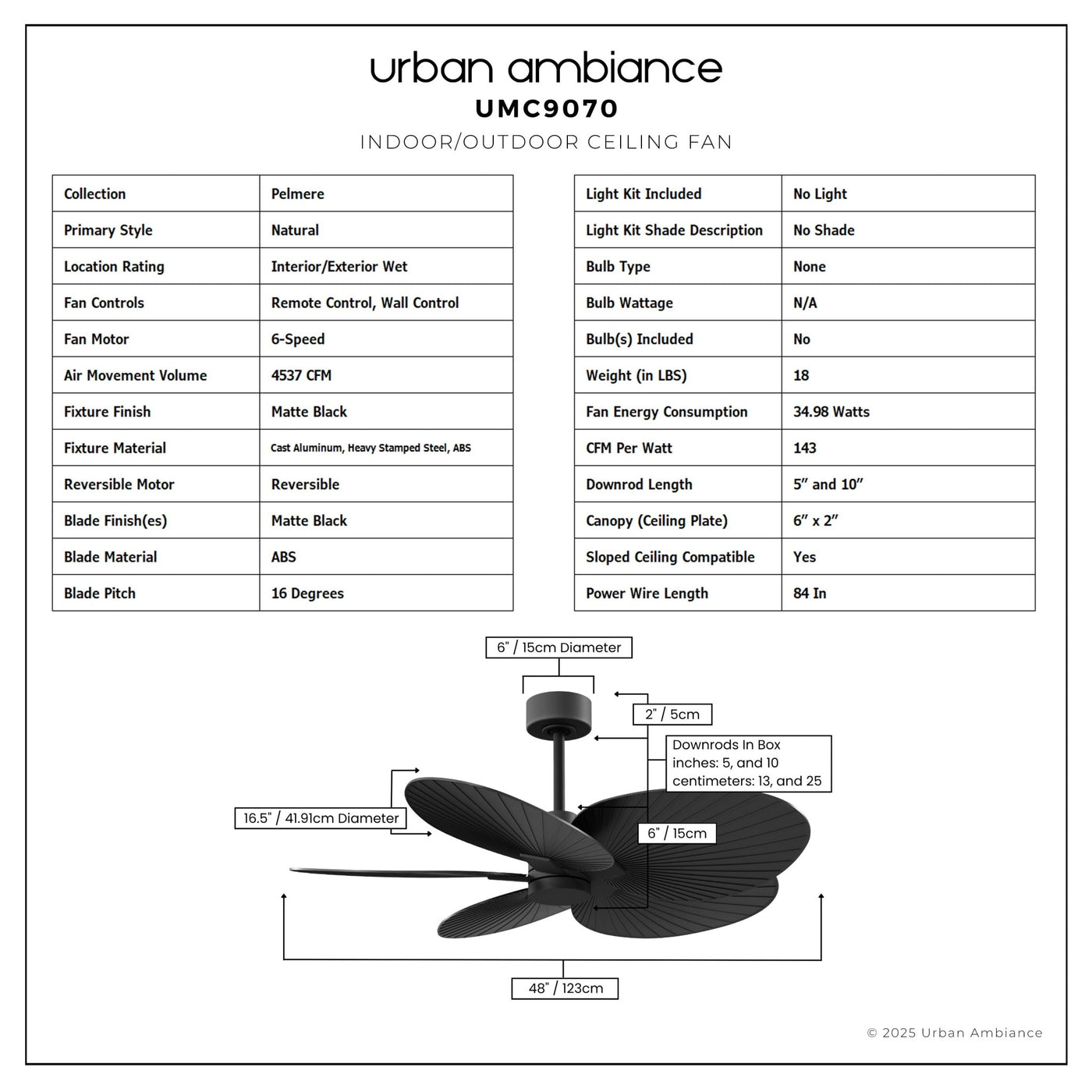 UMC9070 Natural Indoor/Outdoor Ceiling Fan, 8" (Plus Downrod) H x 48" W x 48" D, Matte Black Finish, Pelmere Collection