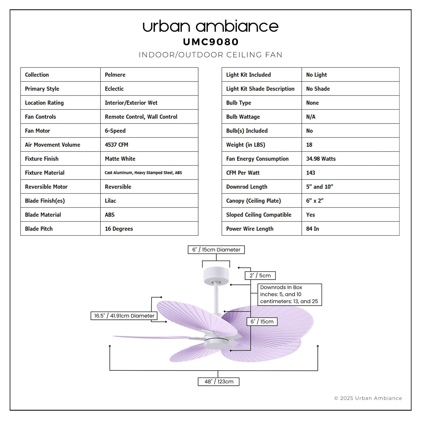 UMC9080 Eclectic Indoor/Outdoor Ceiling Fan, 8" (Plus Downrod) H x 48" W x 48" D, Matte White Finish, Pelmere Collection