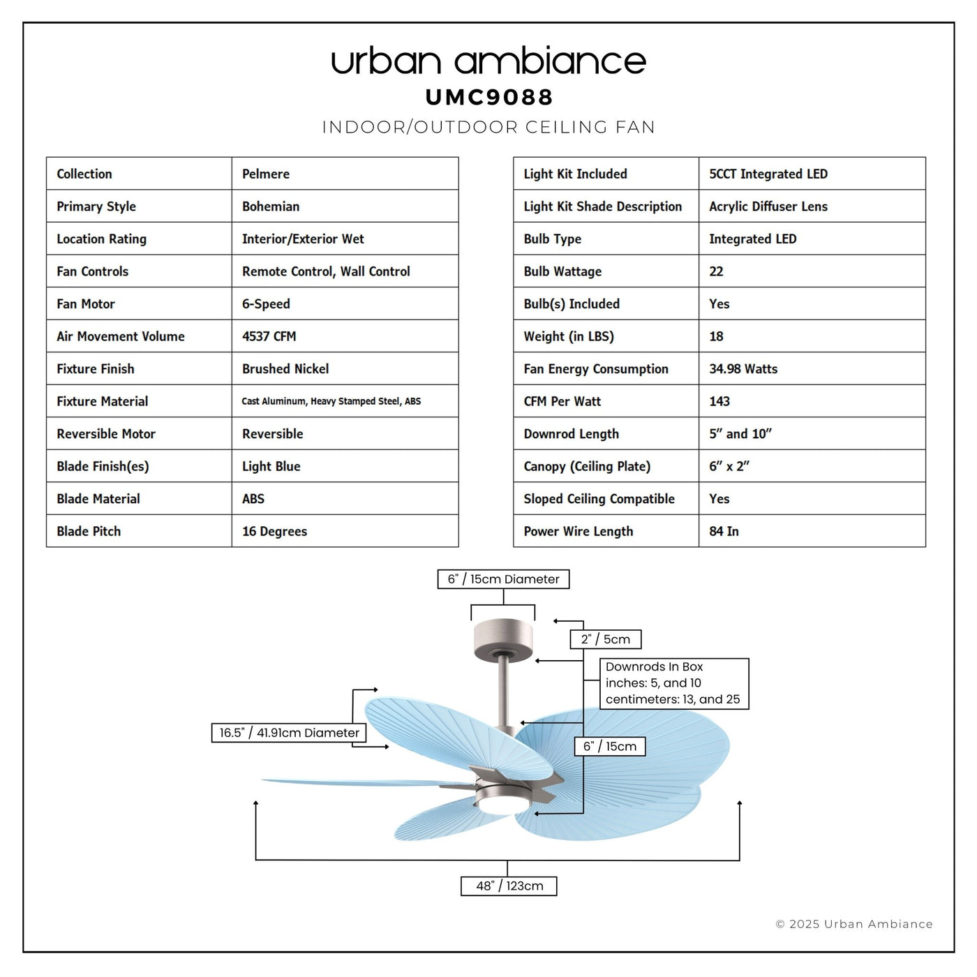 UMC9088 Bohemian Indoor/Outdoor Ceiling Fan, 8" (Plus Downrod) H x 48" W x 48" D, Brushed Nickel Finish, Pelmere Collection