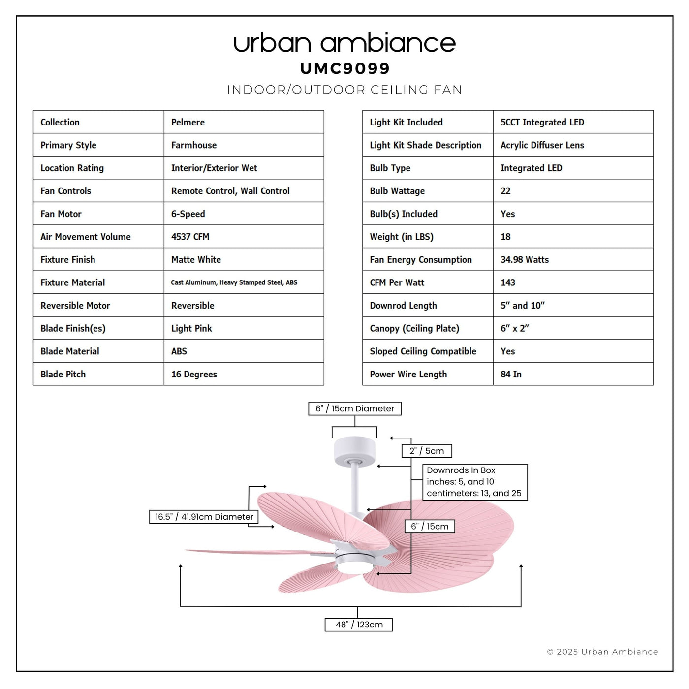 UMC9099 Contemporary Indoor/Outdoor Ceiling Fan, 8" (Plus Downrod) H x 48" W x 48" D, Matte White Finish, Pelmere Collection