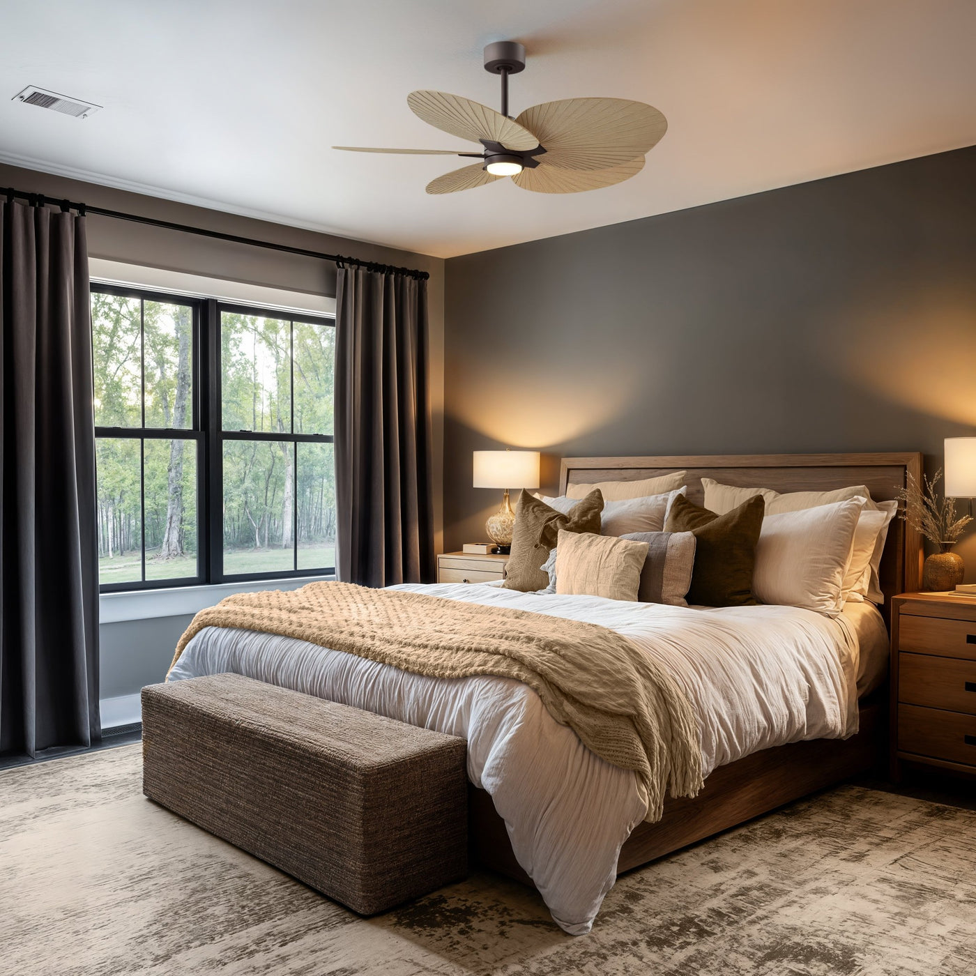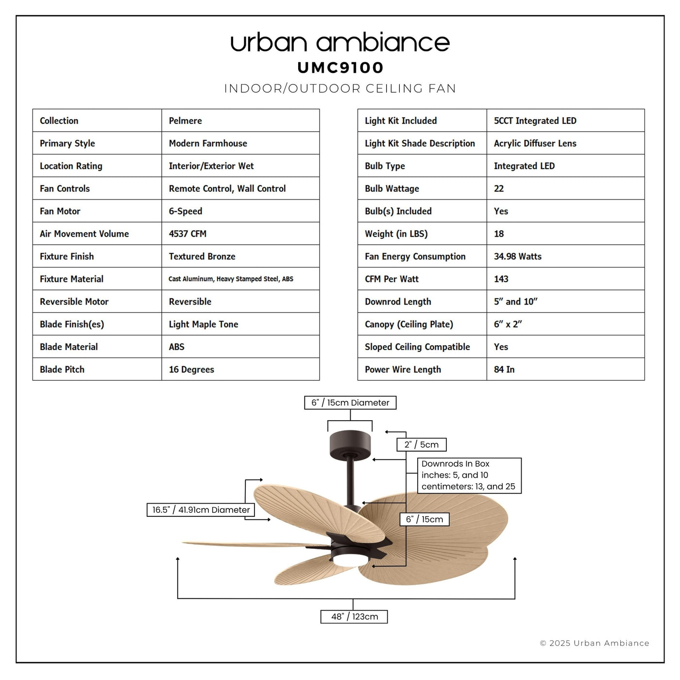 UMC9100 Modern Farmhouse Indoor/Outdoor Ceiling Fan, 8" (Plus Downrod) H x 48" W x 48" D, Textured Bronze Finish, Pelmere Collection
