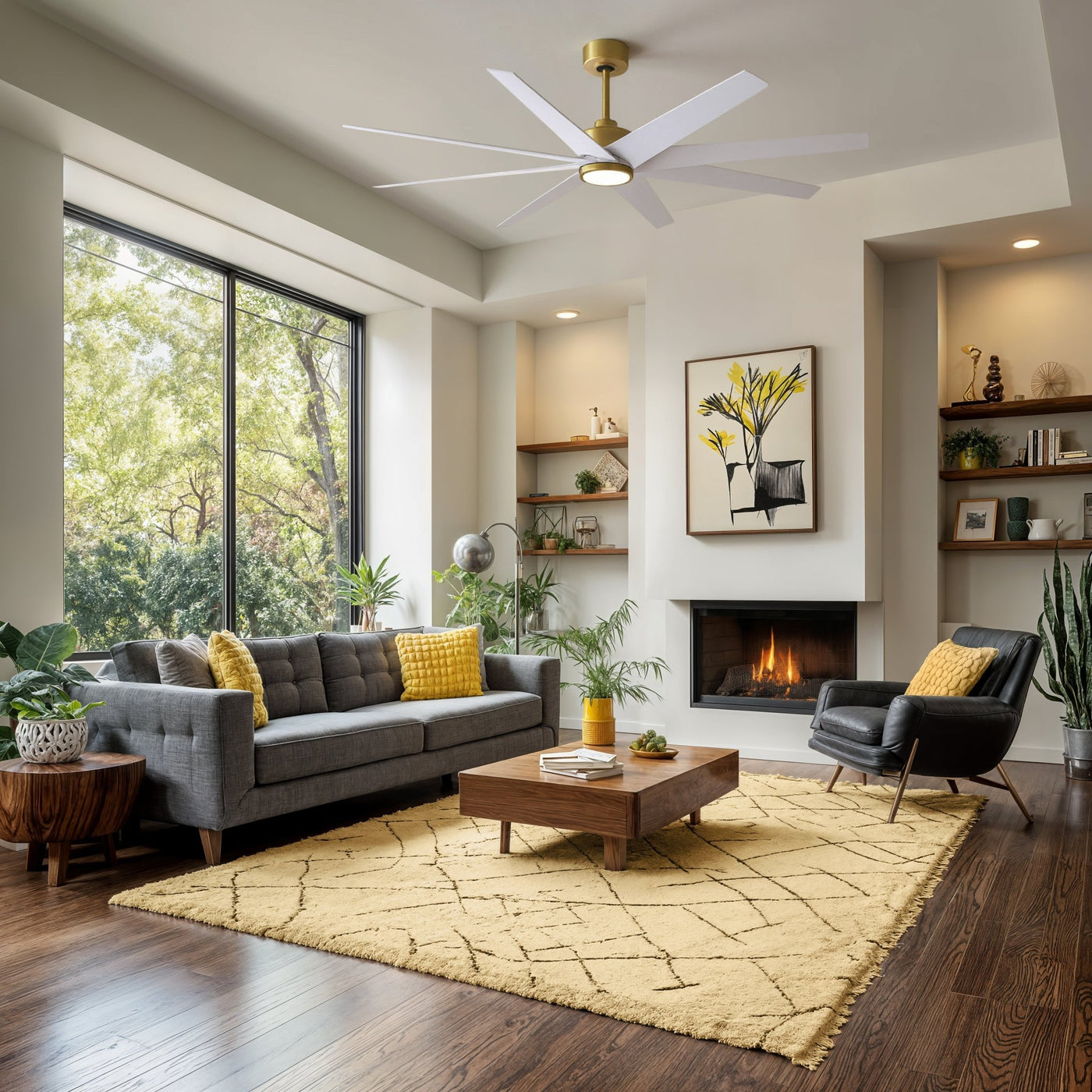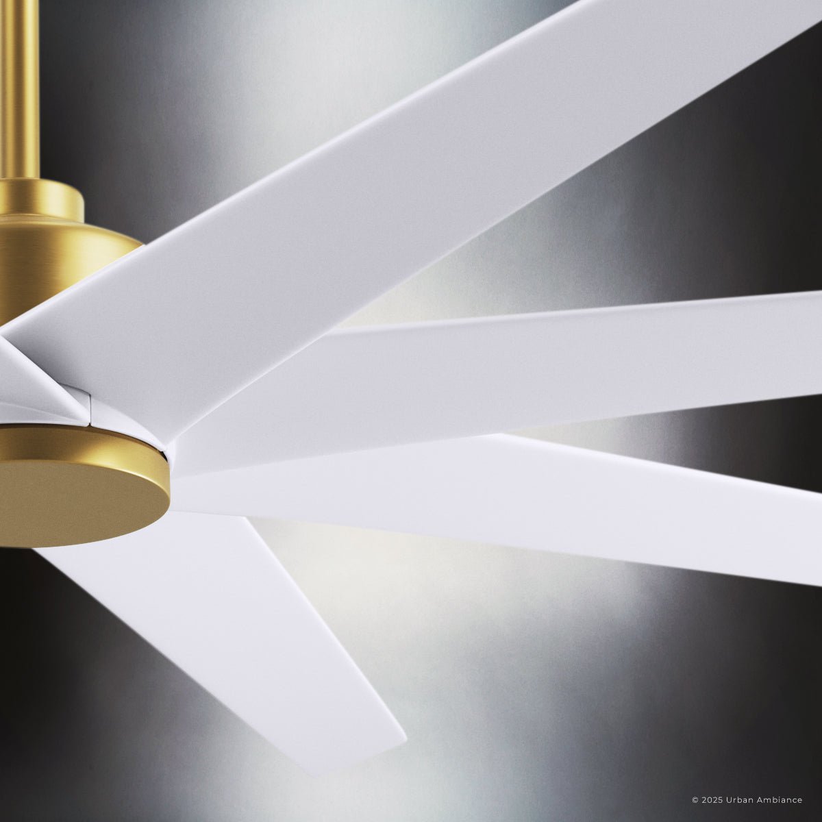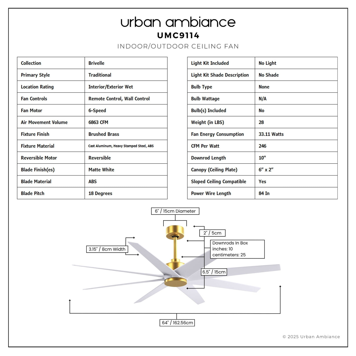 UMC9114 Glam Indoor/Outdoor Ceiling Fan, 8.5" (Plus Downrod) H x 64" W x 64" D, Brushed Brass Finish, Brivelle Collection