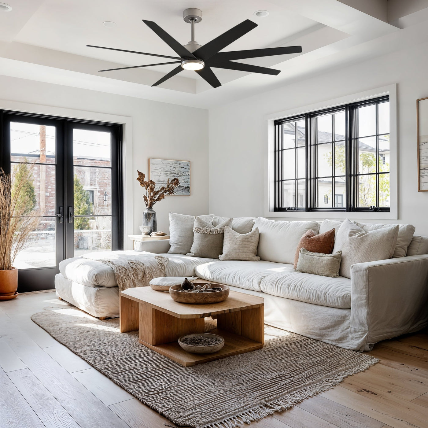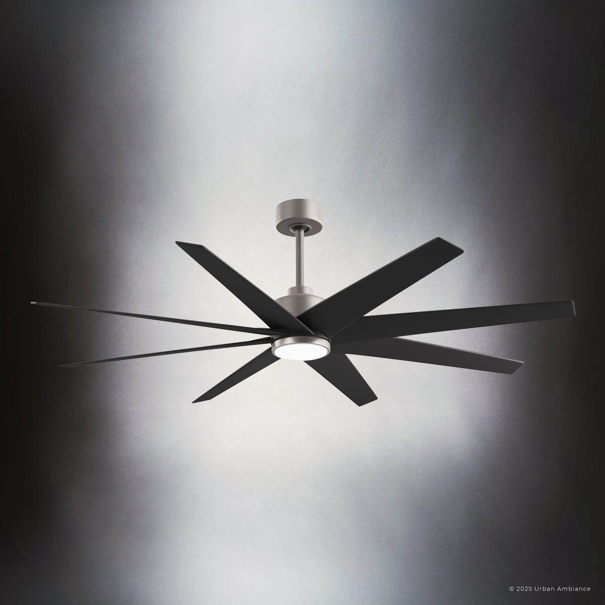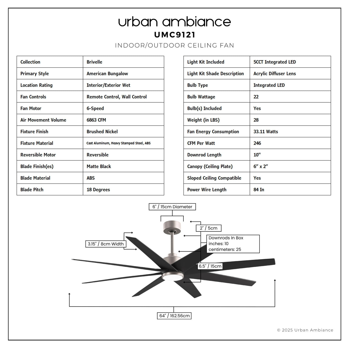 UMC9121 American Bungalow Indoor/Outdoor Ceiling Fan, 9" (Plus Downrod) H x 64" W x 64" D, Brushed Nickel Finish, Brivelle Collection