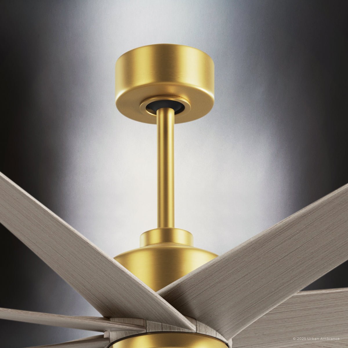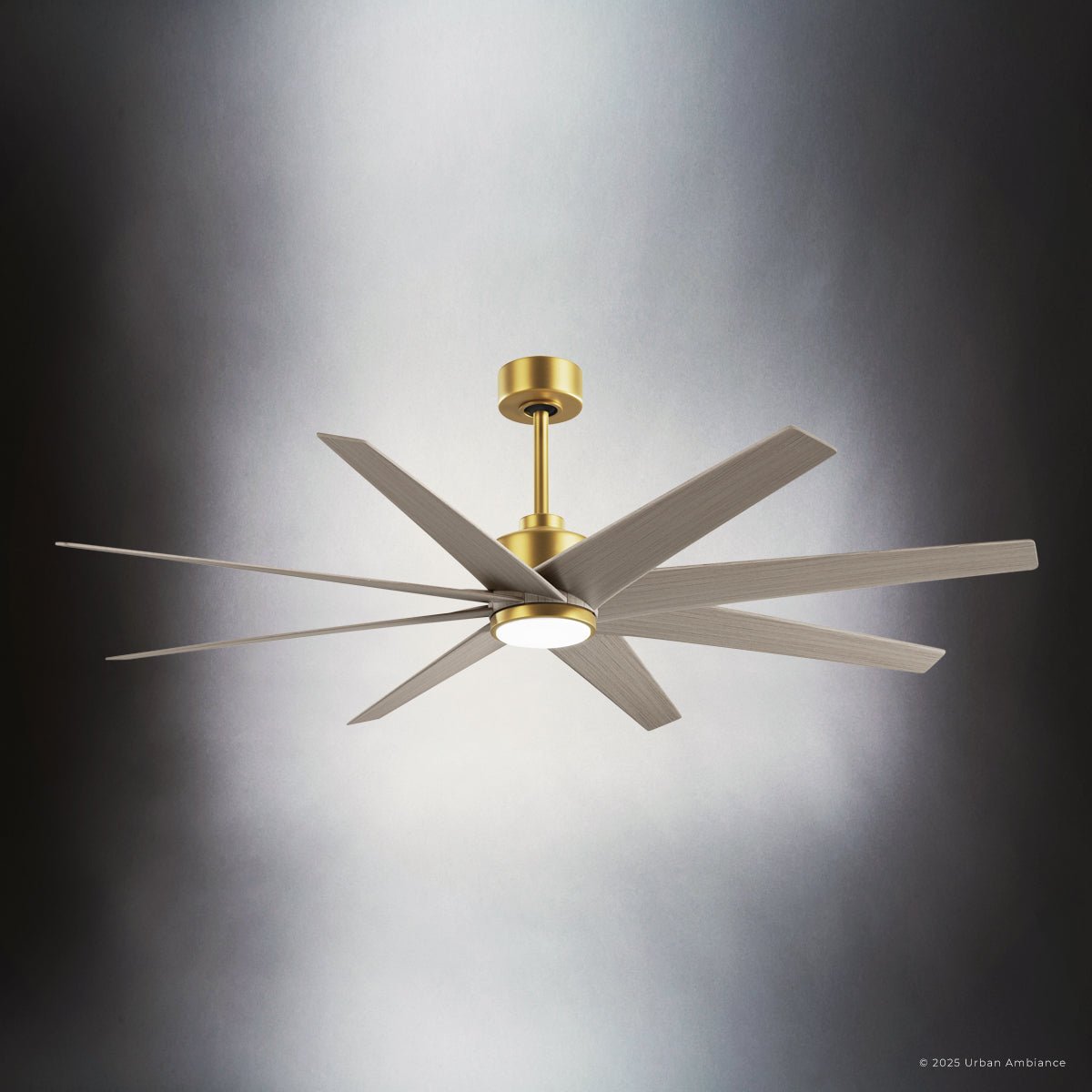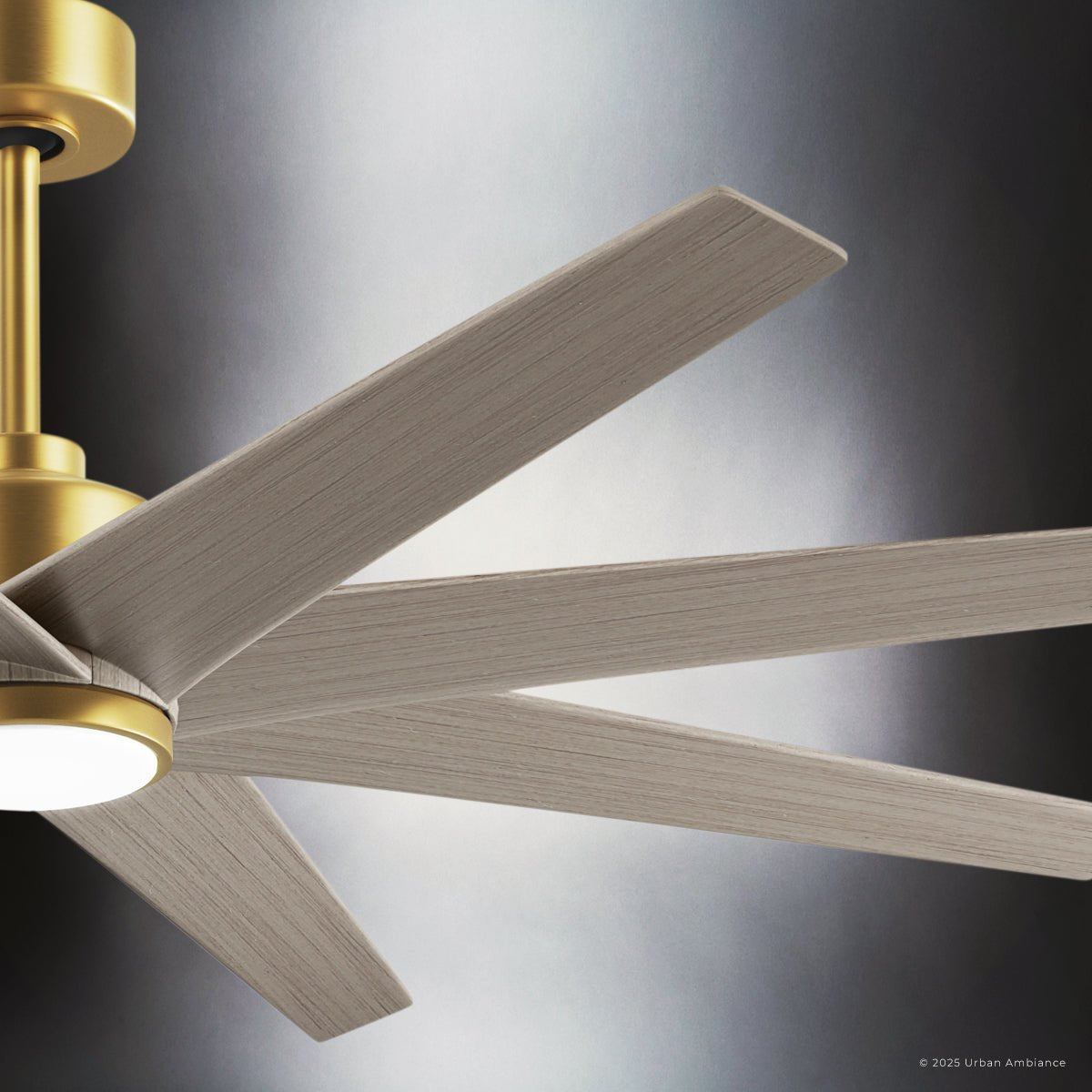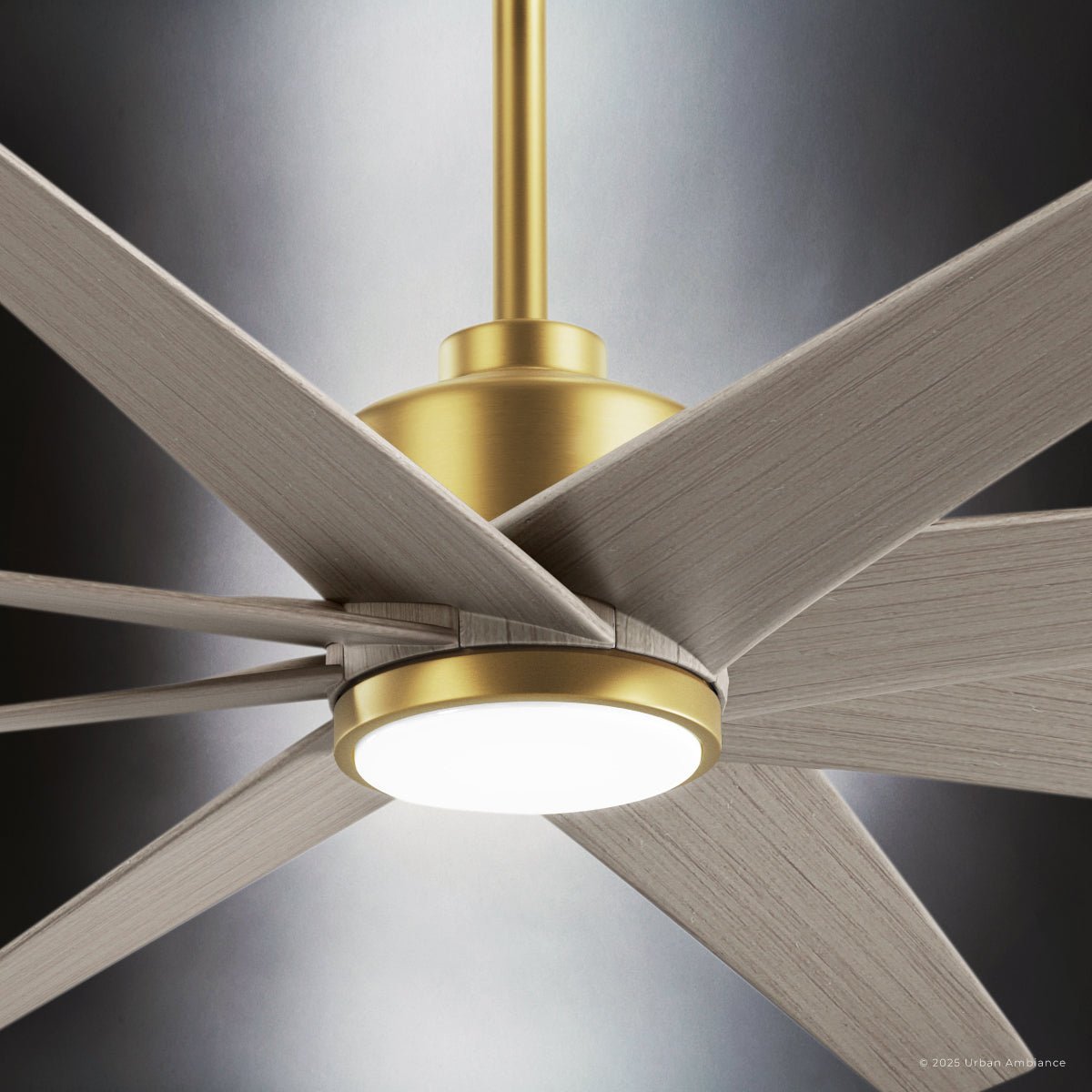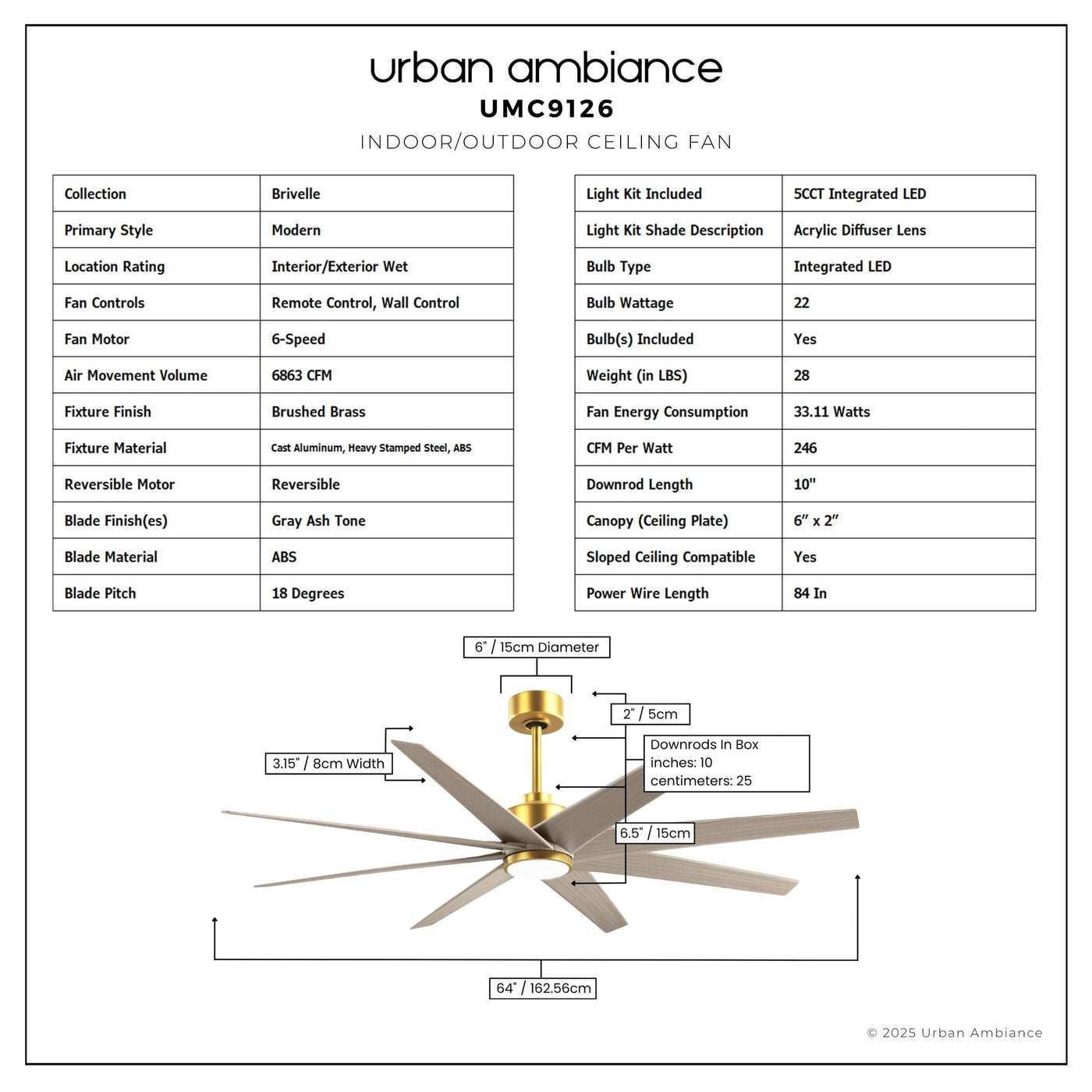 UMC9126 Modern Indoor/Outdoor Ceiling Fan, 9" (Plus Downrod) H x 64" W x 64" D, Brushed Brass Finish, Brivelle Collection