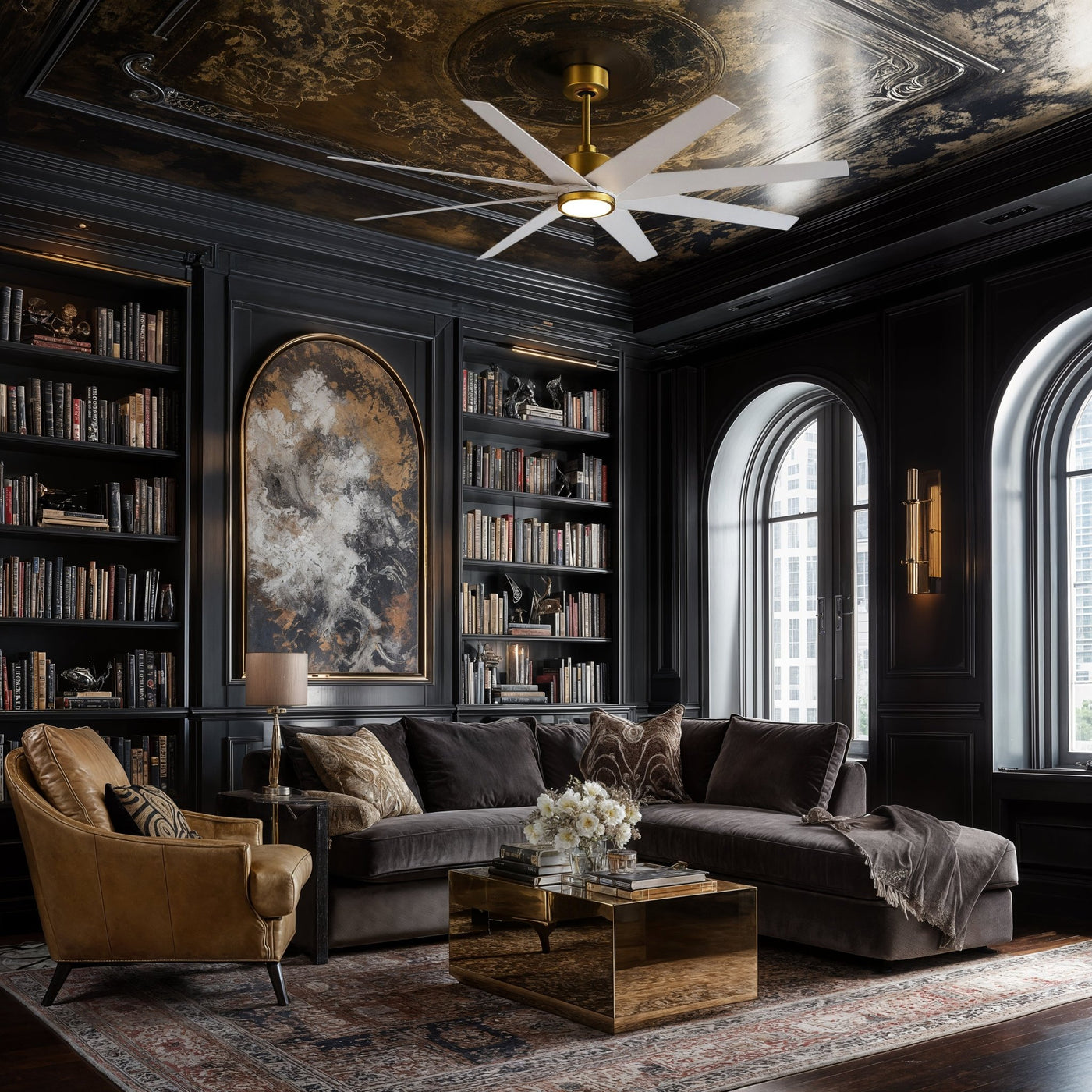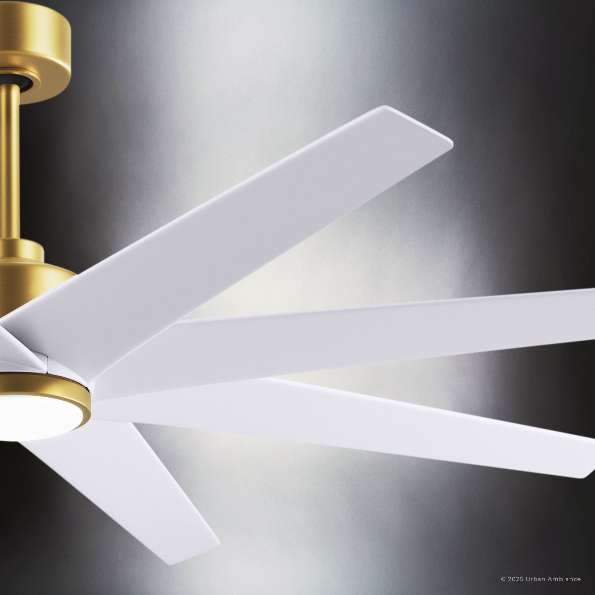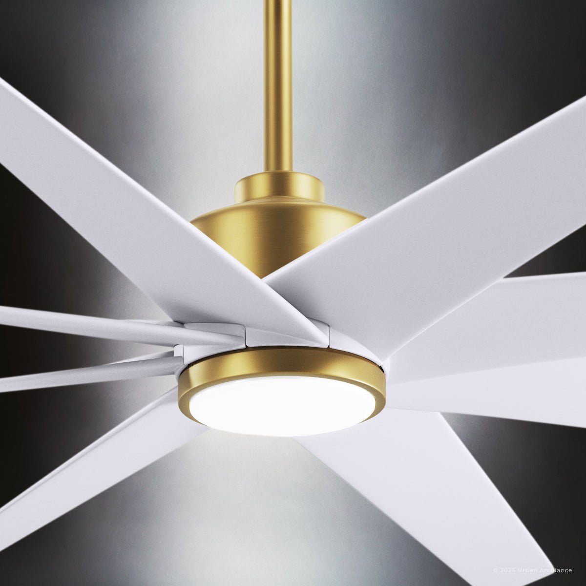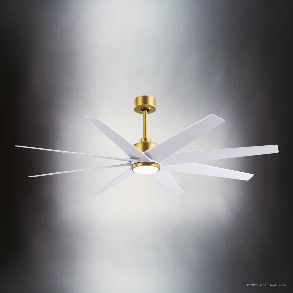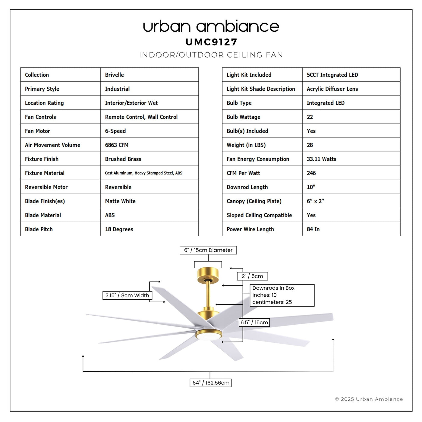 UMC9127 Industrial Indoor/Outdoor Ceiling Fan, 9" (Plus Downrod) H x 64" W x 64" D, Brushed Brass Finish, Brivelle Collection