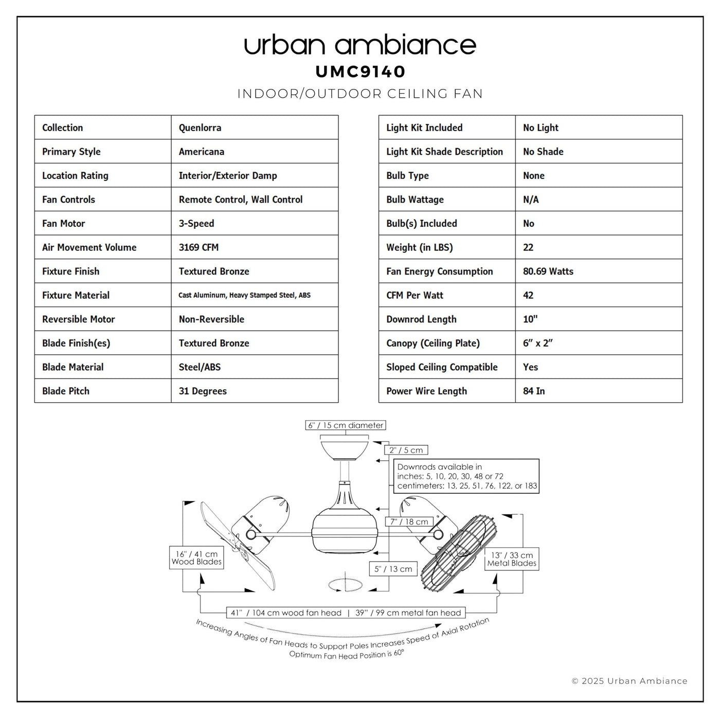 UMC9140 Americana Indoor/Outdoor Ceiling Fan, 14" (Plus Downrod) H x 40" W x 40" D, Textured Bronze Finish, Quenlorra Collection