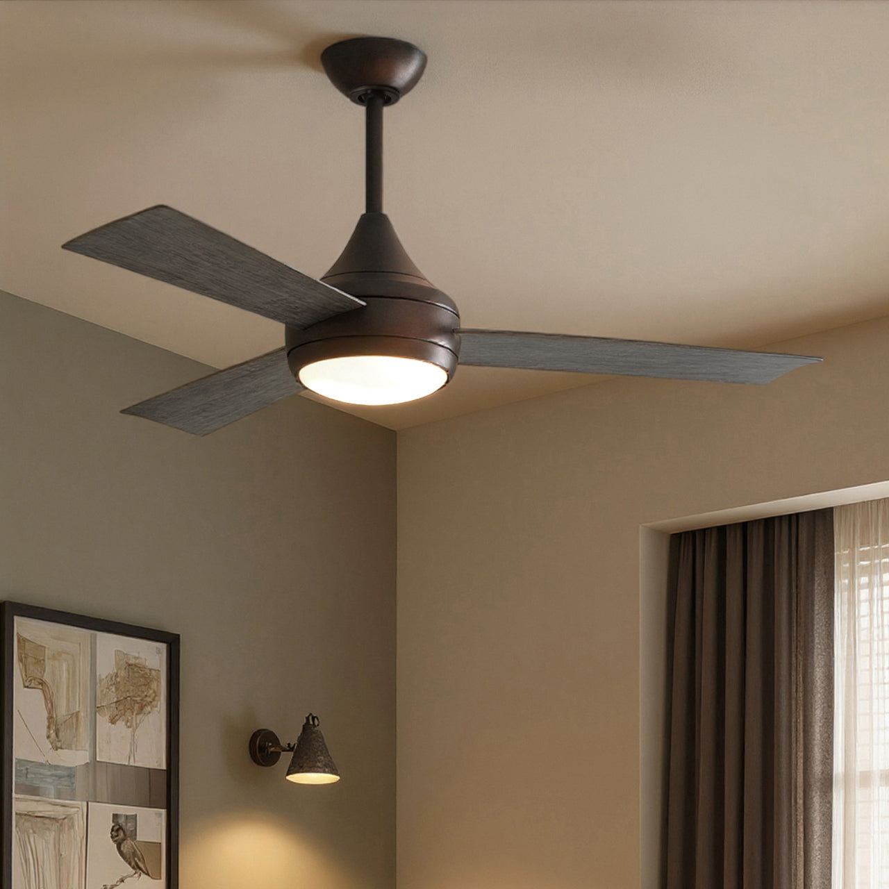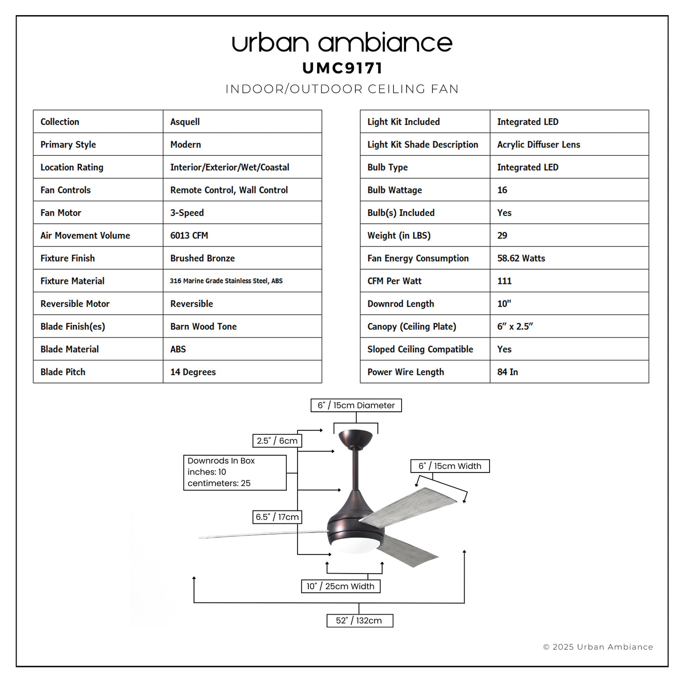UMC9171 Modern Indoor/Outdoor Ceiling Fan, 9" (Plus Downrod) H x 52" W x 52" D, Brushed Bronze Finish, Asquell Collection
