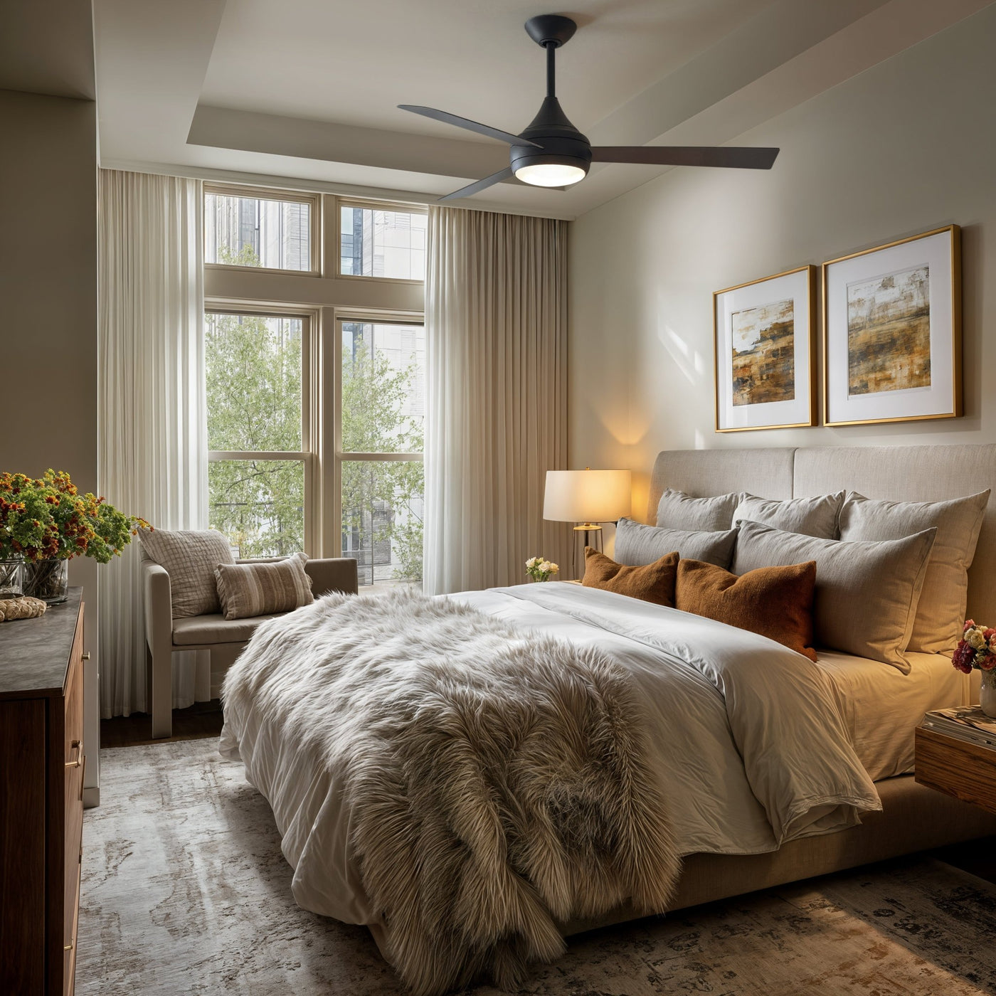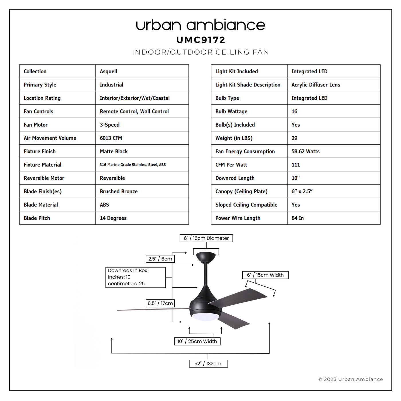 UMC9172 Industrial Indoor/Outdoor Ceiling Fan, 9" (Plus Downrod) H x 52" W x 52" D, Matte Black Finish, Asquell Collection