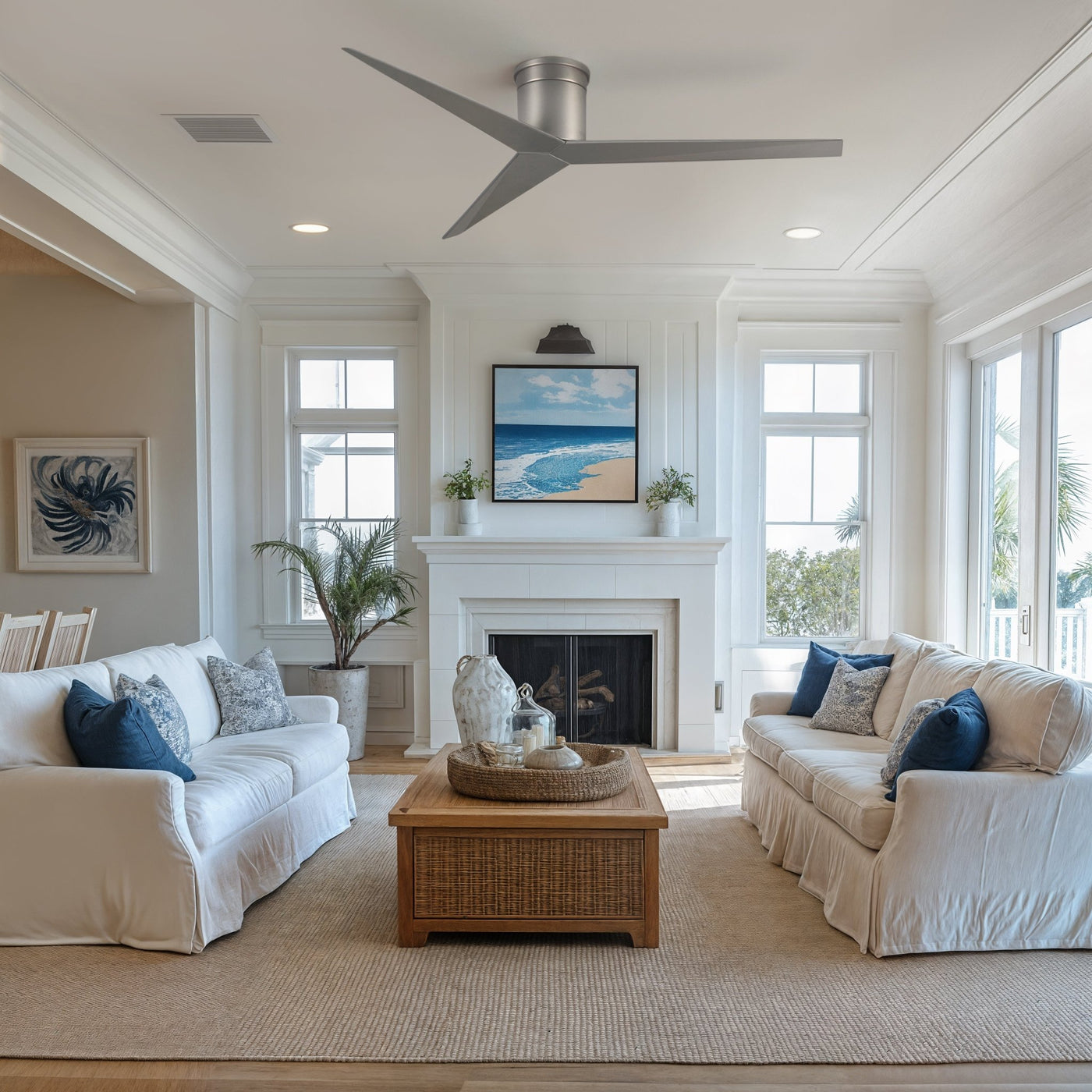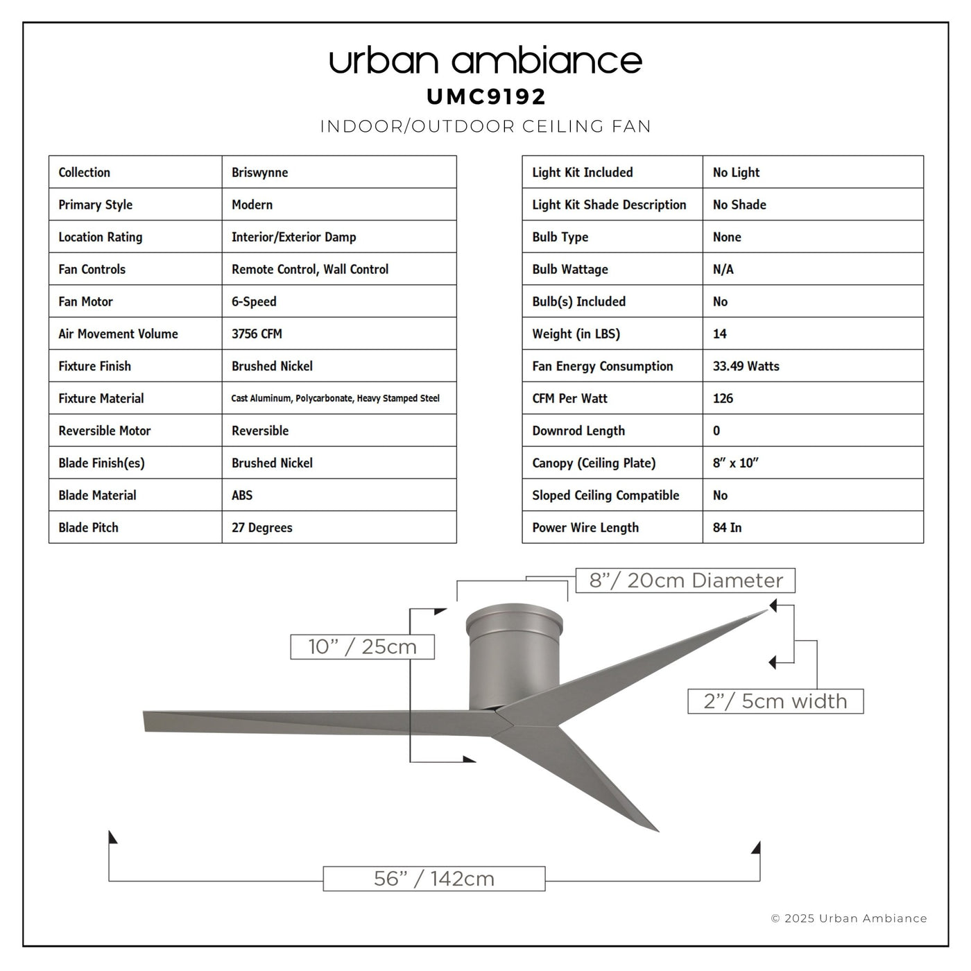 UMC9192 Modern Indoor/Outdoor Ceiling Fan, 10" H x 56" W x 56" D, Brushed Nickel Finish, Briswynne Collection