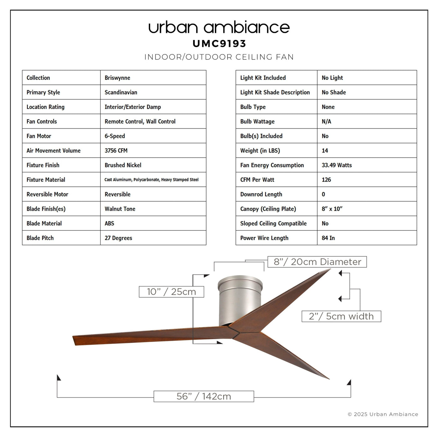 UMC9193 Scandinavian Indoor/Outdoor Ceiling Fan, 10" H x 56" W x 56" D, Brushed Nickel Finish, Briswynne Collection