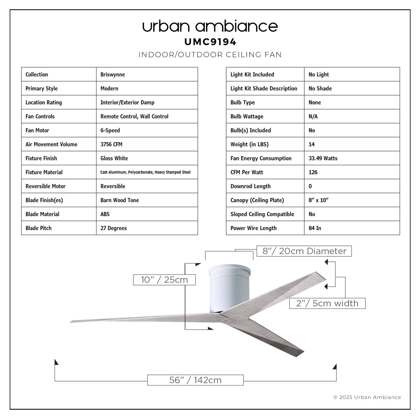 UMC9194 Modern Indoor/Outdoor Ceiling Fan, 10" H x 56" W x 56" D, Gloss White Finish, Briswynne Collection