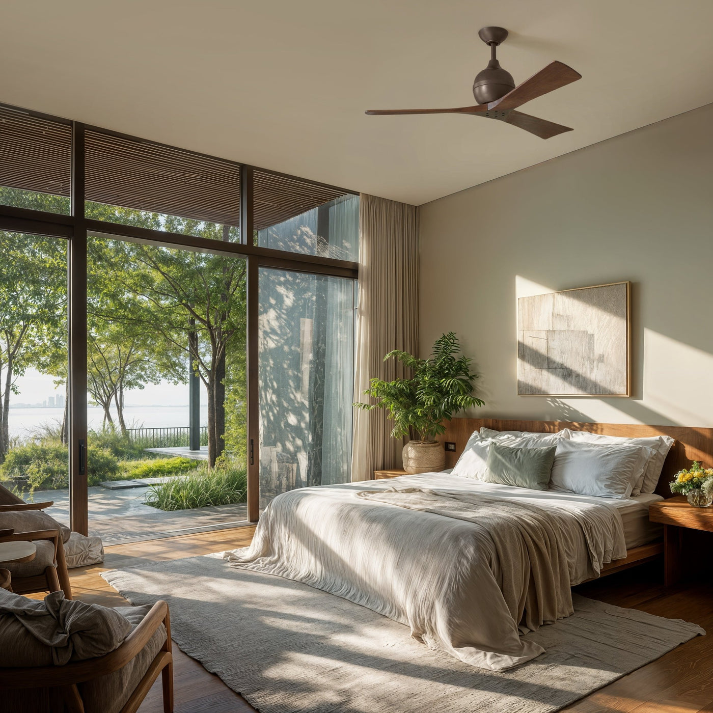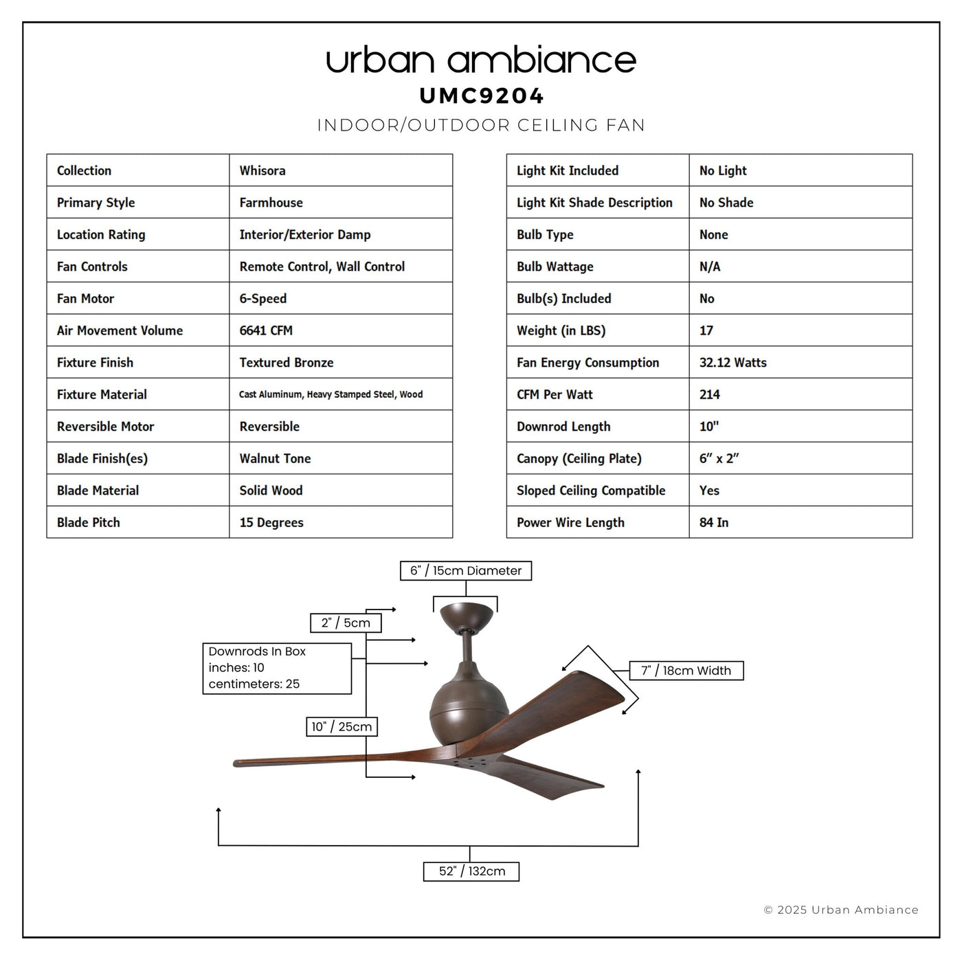 UMC9204 Farmhouse Indoor/Outdoor Ceiling Fan, 12" (Plus Downrod) H x 52" W x 52" D, Textured Bronze Finish, Whisora Collection