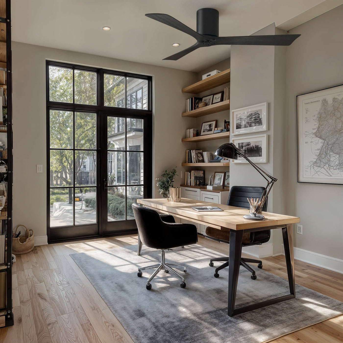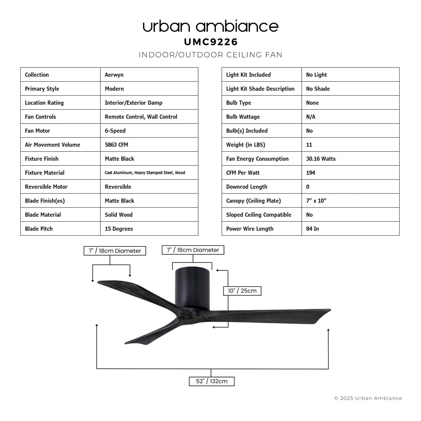 UMC9226 Modern Indoor/Outdoor Ceiling Fan, 10" H x 52" W x 52" D, Matte Black Finish, Aerwyn Collection