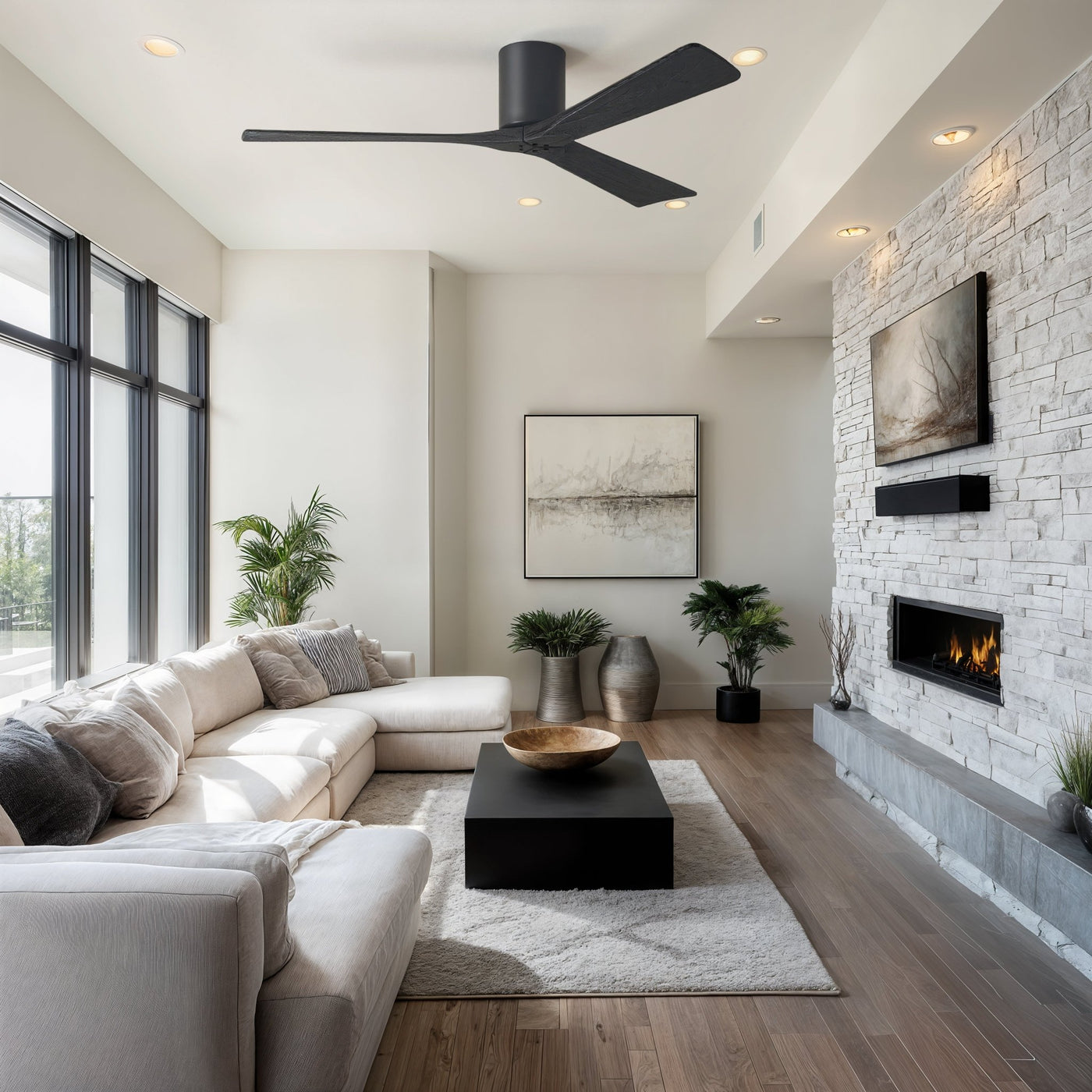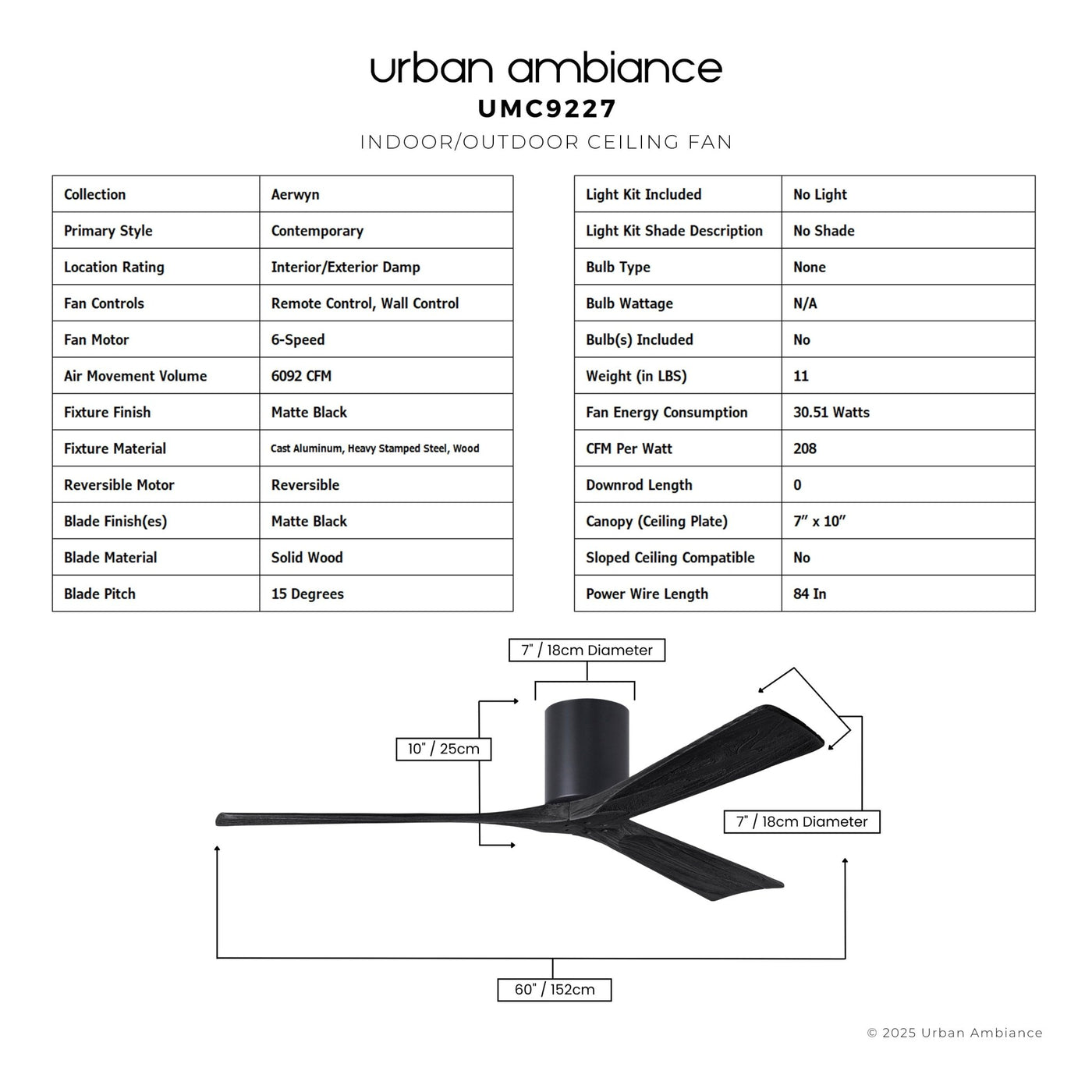 UMC9227 Contemporary Indoor/Outdoor Ceiling Fan, 10" H x 60" W x 60" D, Matte Black Finish, Aerwyn Collection