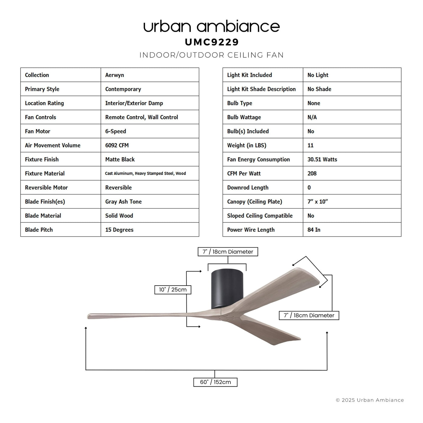 UMC9229 Contemporary Indoor/Outdoor Ceiling Fan, 10" H x 60" W x 60" D, Matte Black Finish, Aerwyn Collection