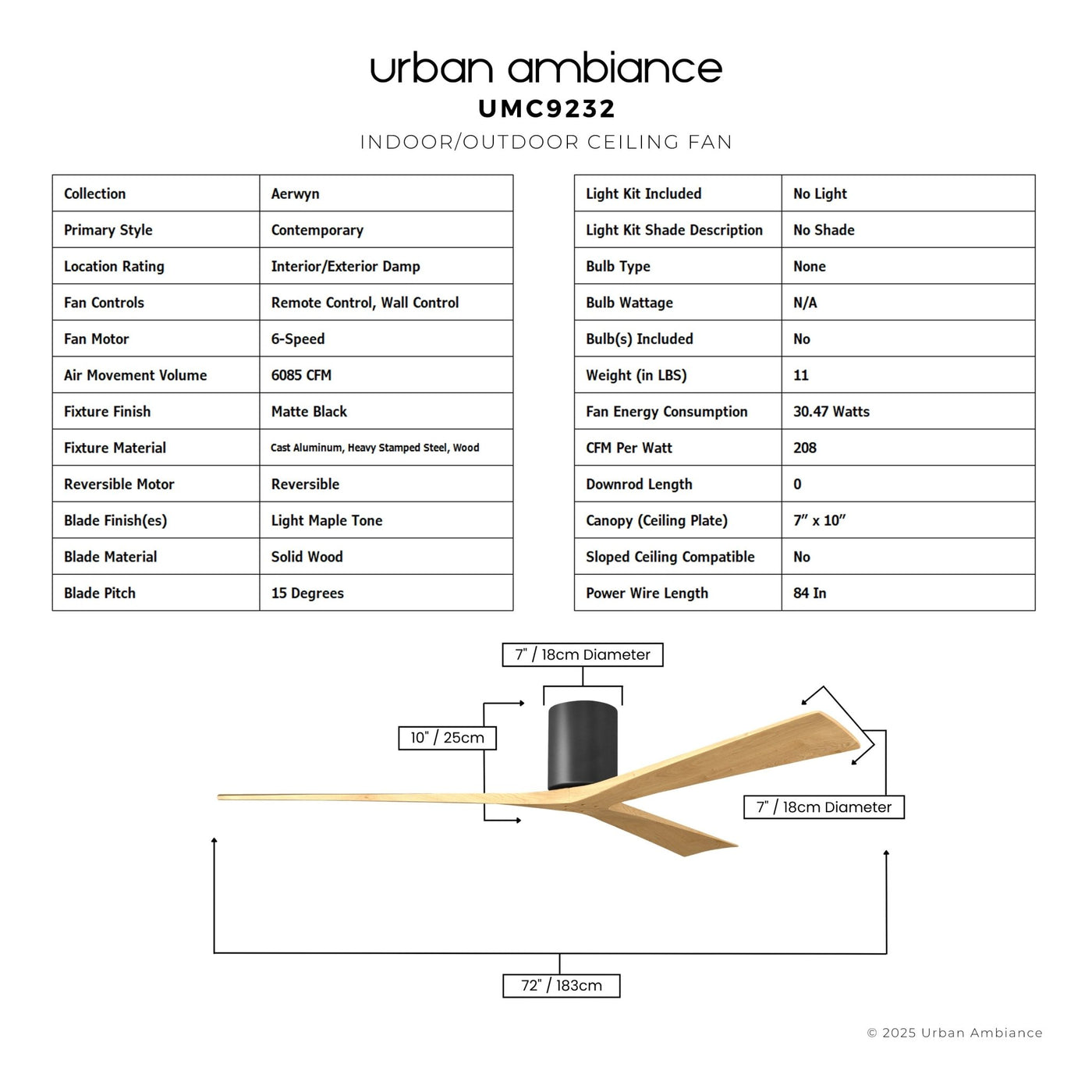 UMC9232 Contemporary Indoor/Outdoor Ceiling Fan, 10" H x 72" W x 72" D, Matte Black Finish, Aerwyn Collection