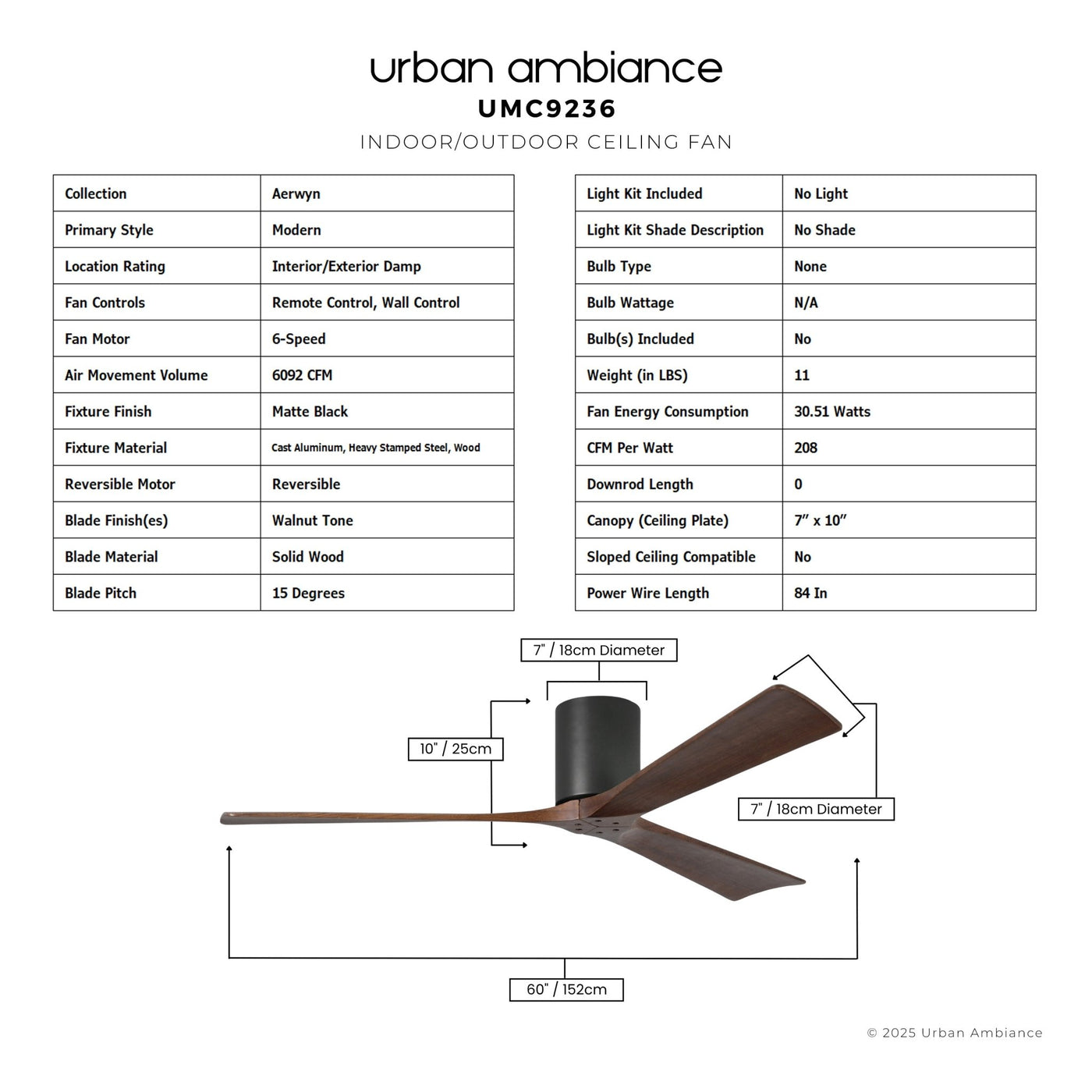 UMC9236 Modern Indoor/Outdoor Ceiling Fan, 10" H x 60" W x 60" D, Matte Black Finish, Aerwyn Collection