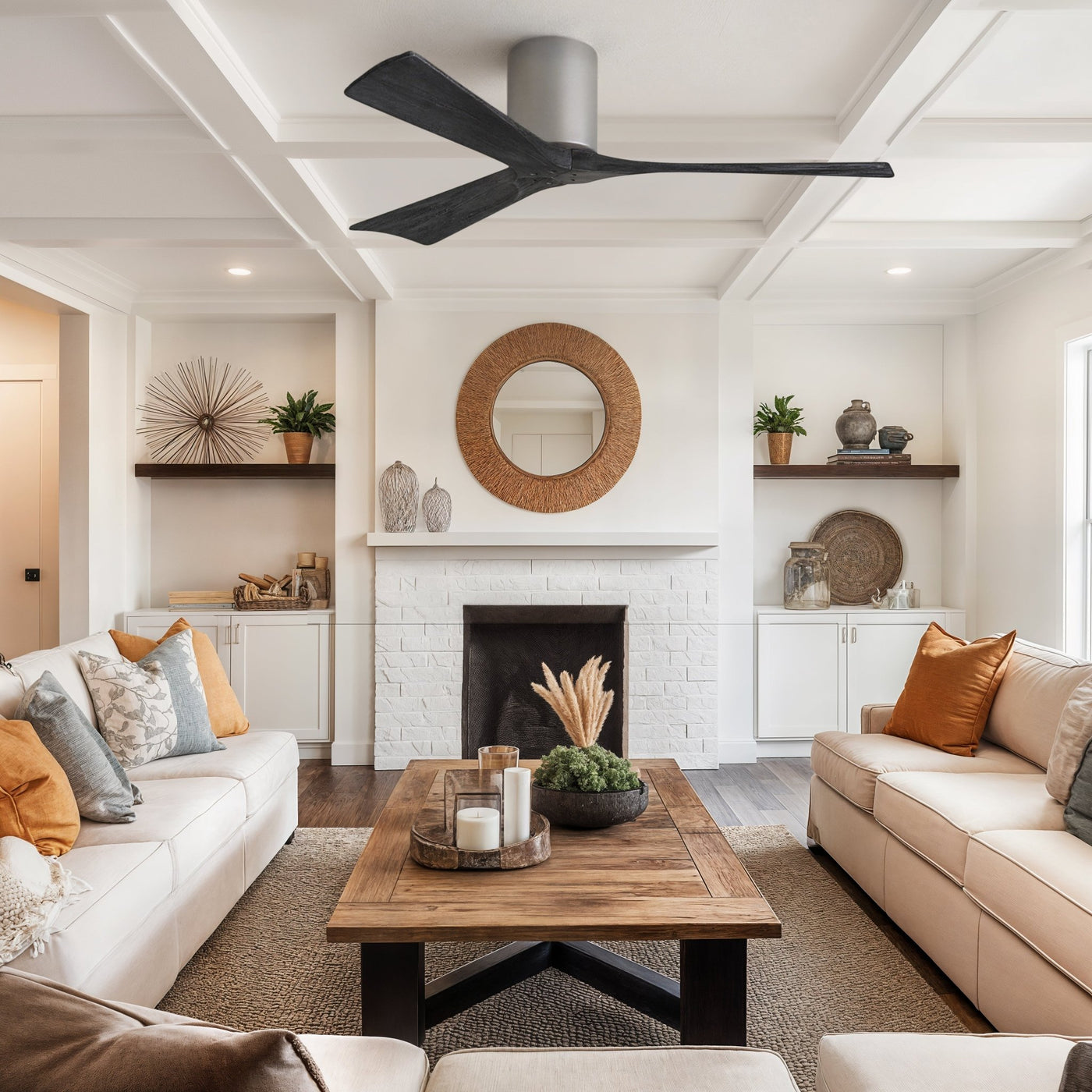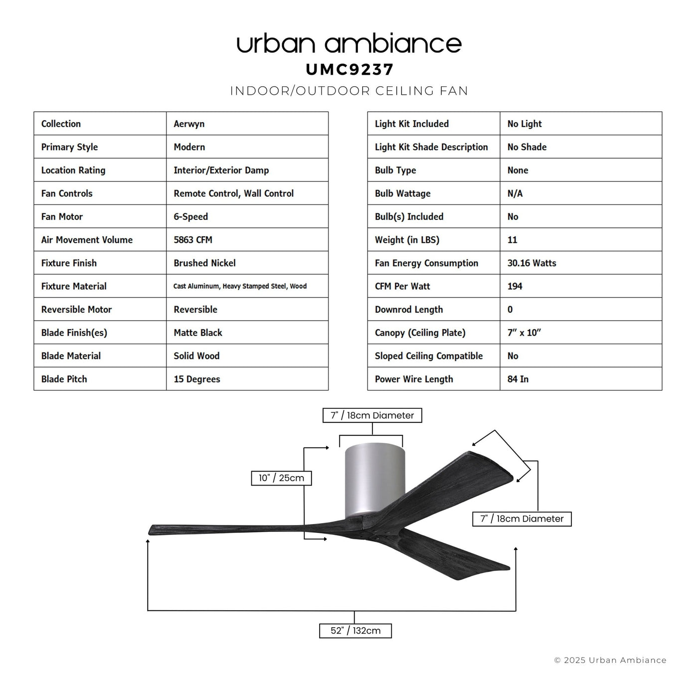 UMC9237 Modern Indoor/Outdoor Ceiling Fan, 10" H x 52" W x 52" D, Brushed Nickel Finish, Aerwyn Collection