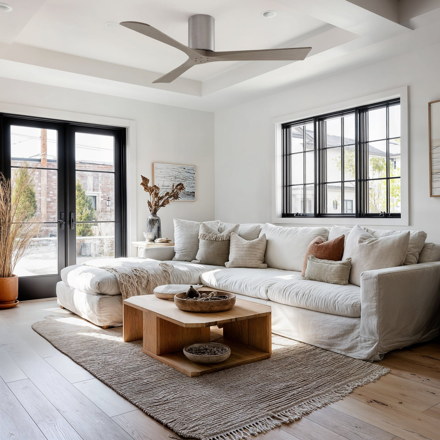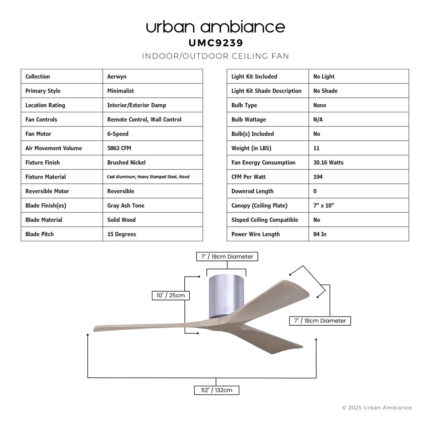 UMC9239 Minimalist Indoor/Outdoor Ceiling Fan, 10" H x 52" W x 52" D, Brushed Nickel Finish, Aerwyn Collection