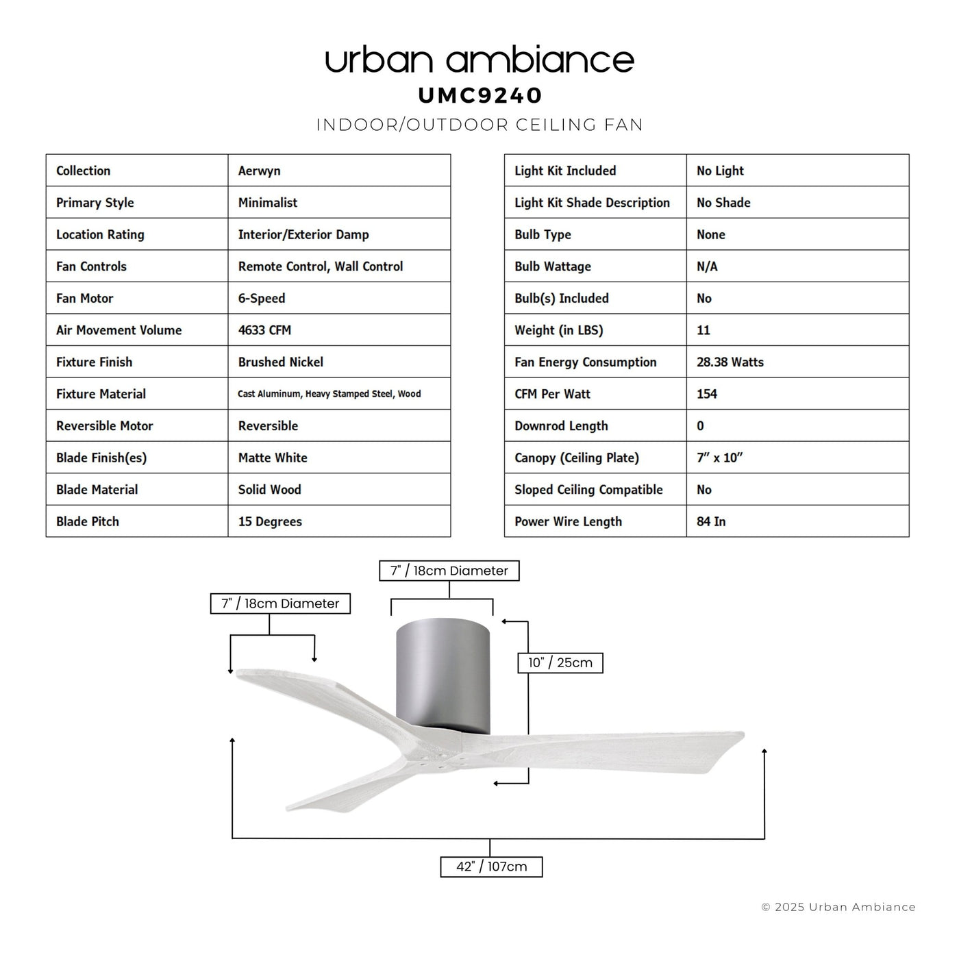 UMC9240 Minimalist Indoor/Outdoor Ceiling Fan, 10" H x 42" W x 42" D, Brushed Nickel Finish, Aerwyn Collection