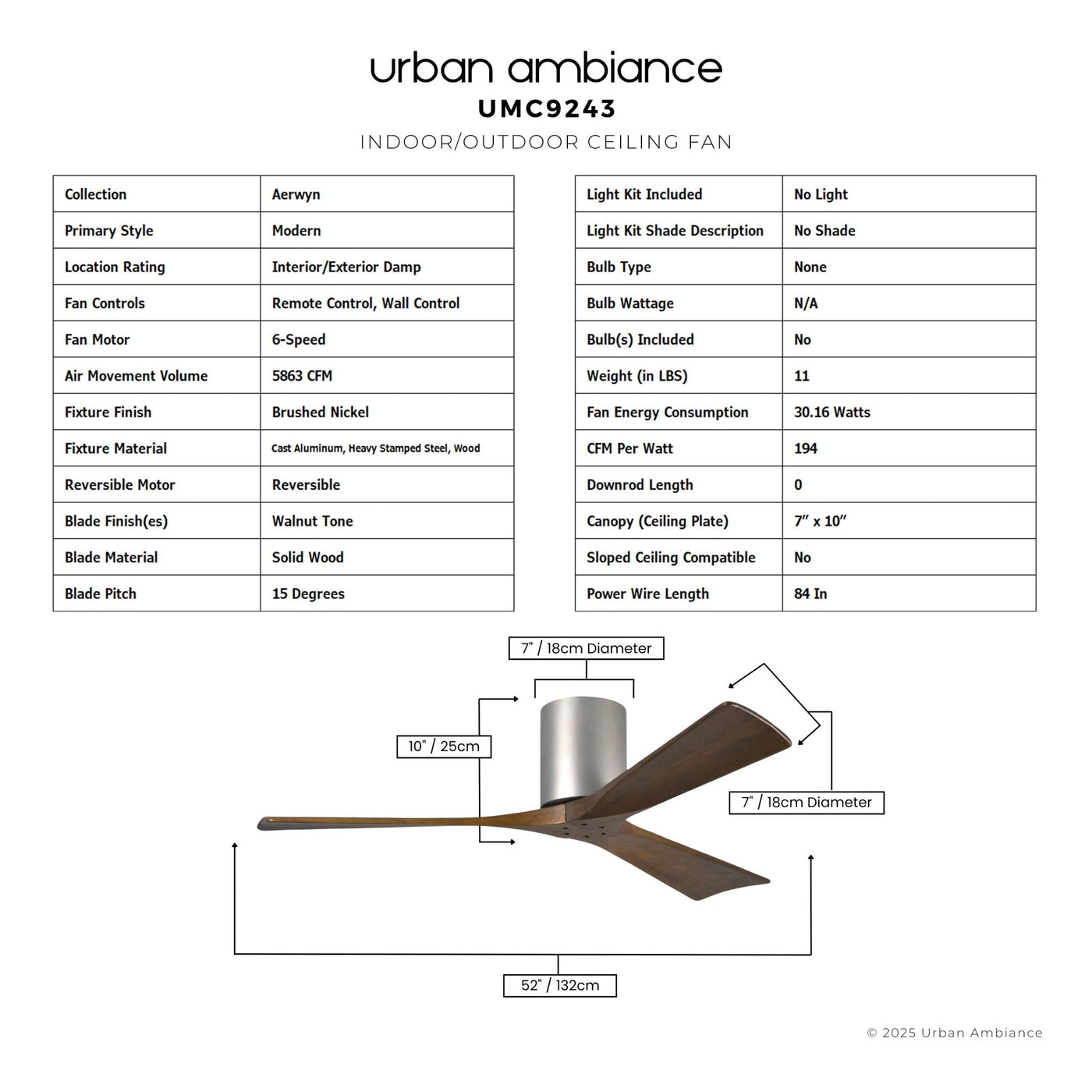 UMC9243 Modern Indoor/Outdoor Ceiling Fan, 10" H x 52" W x 52" D, Brushed Nickel Finish, Aerwyn Collection