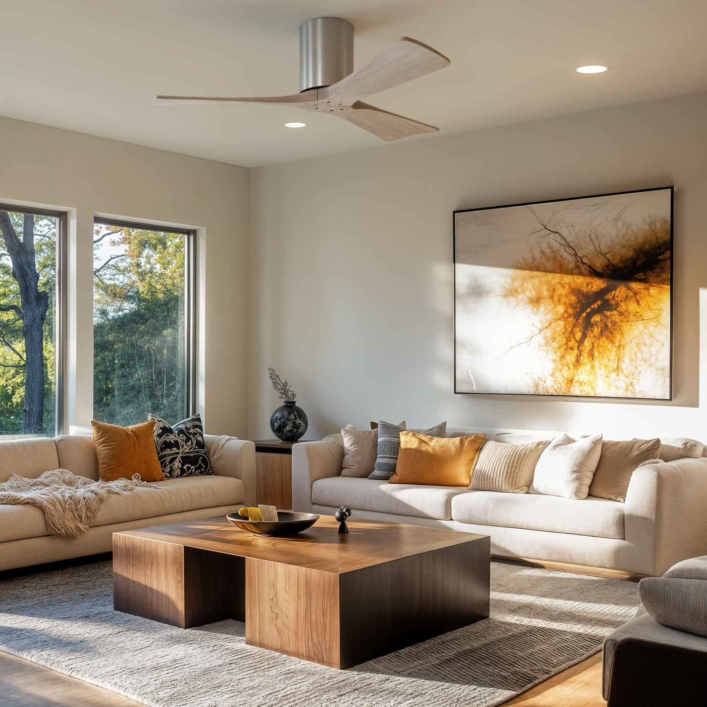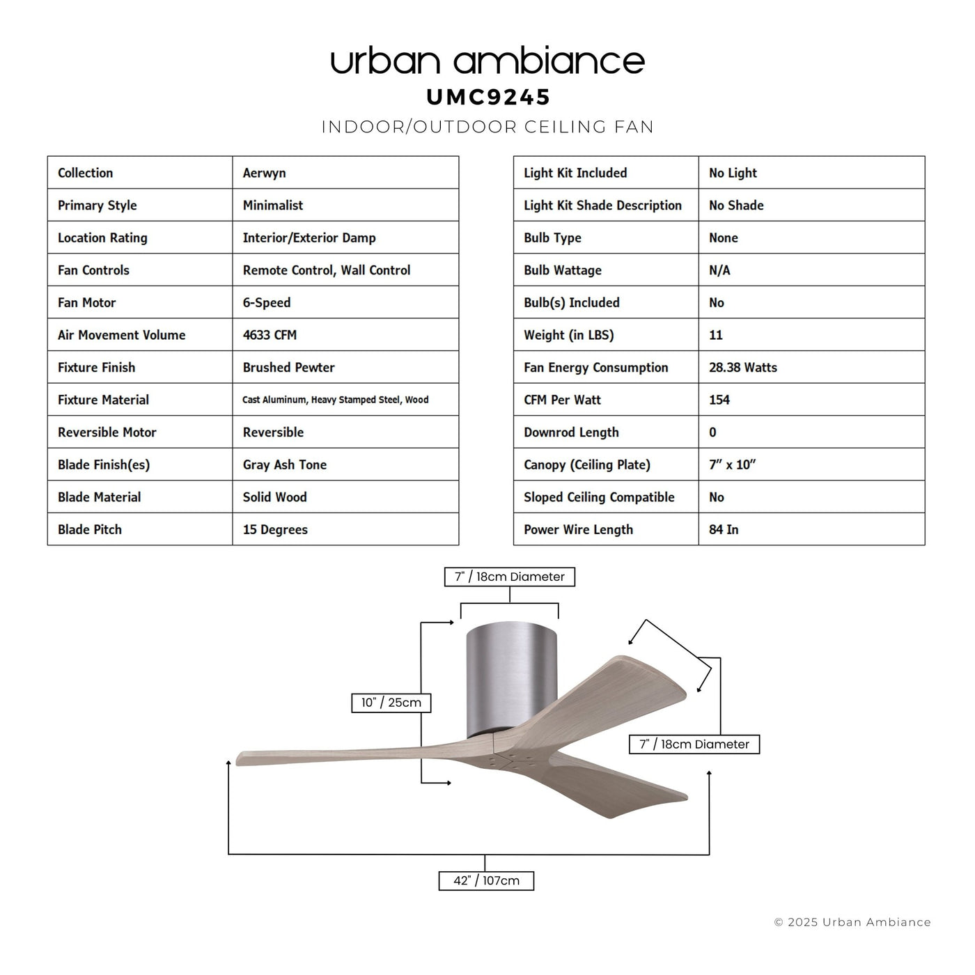 UMC9245 Minimalist Indoor/Outdoor Ceiling Fan, 10" H x 42" W x 42" D, Brushed Pewter Finish, Aerwyn Collection