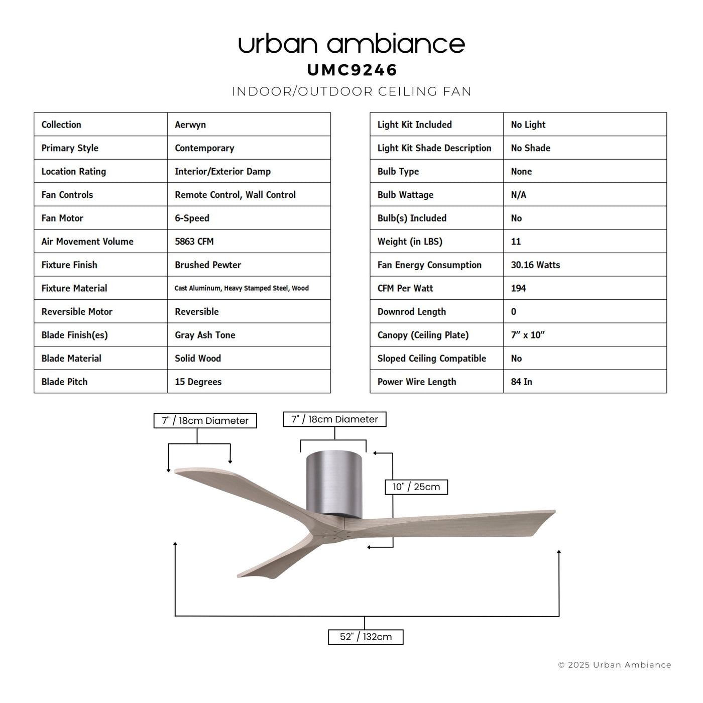 UMC9246 Contemporary Indoor/Outdoor Ceiling Fan, 10" H x 52" W x 52" D, Brushed Pewter Finish, Aerwyn Collection