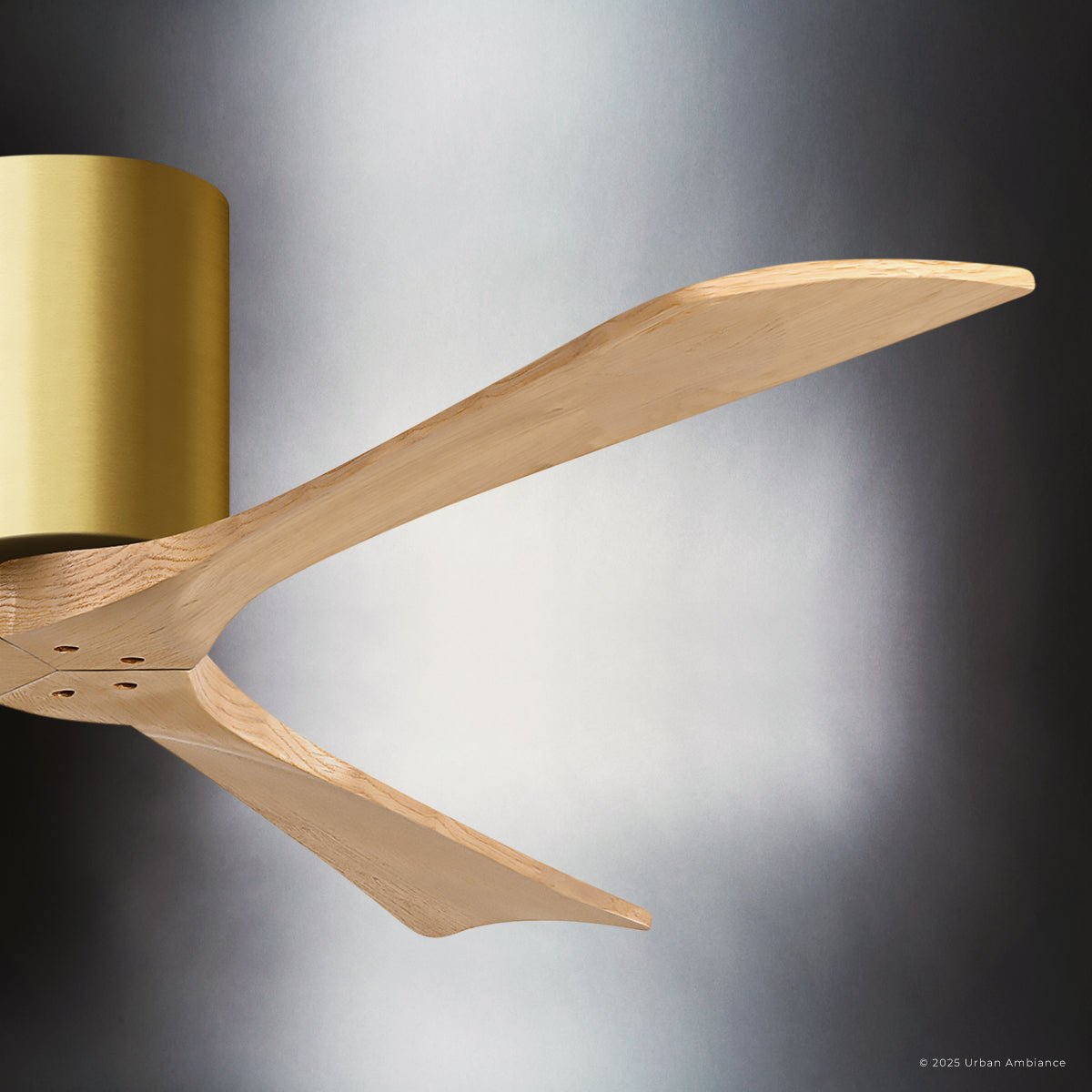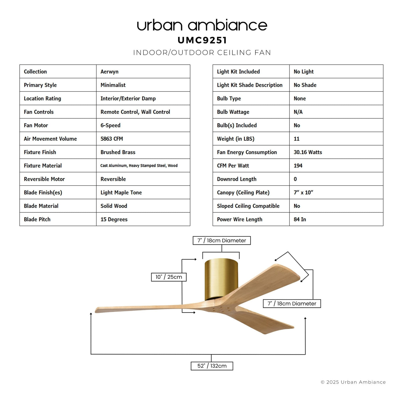 UMC9251 Minimalist Indoor/Outdoor Ceiling Fan, 10" H x 52" W x 52" D, Brushed Brass Finish, Aerwyn Collection