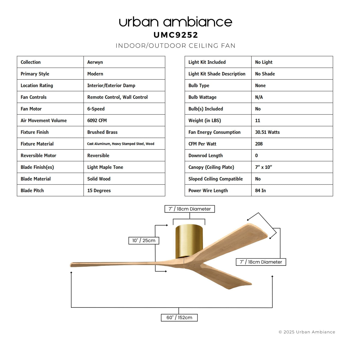 UMC9252 Modern Indoor/Outdoor Ceiling Fan, 10" H x 60" W x 60" D, Brushed Brass Finish, Aerwyn Collection