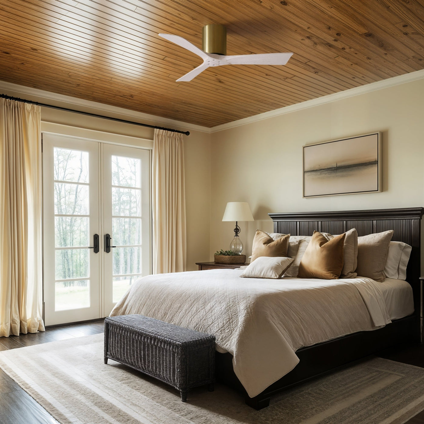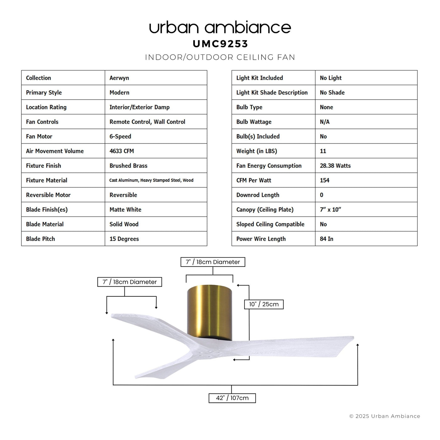 UMC9253 Modern Indoor/Outdoor Ceiling Fan, 10" H x 42" W x 42" D, Brushed Brass Finish, Aerwyn Collection
