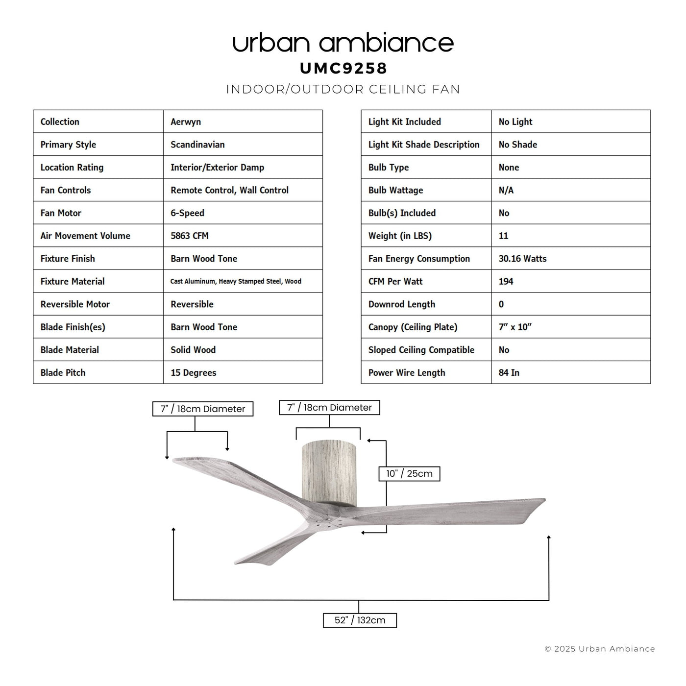 UMC9258 Scandinavian Indoor/Outdoor Ceiling Fan, 10" H x 52" W x 52" D, Barn Wood Tone Finish, Aerwyn Collection
