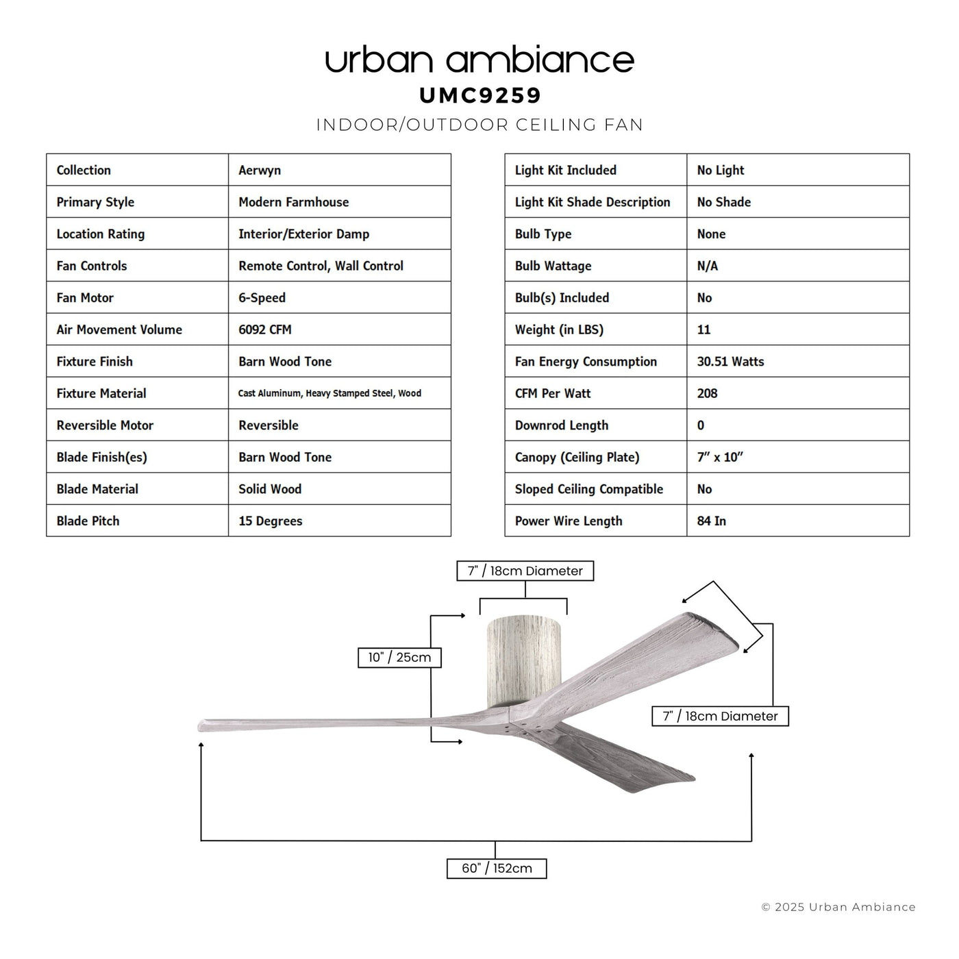 UMC9259 Modern Farmhouse Indoor/Outdoor Ceiling Fan, 10" H x 60" W x 60" D, Barn Wood Tone Finish, Aerwyn Collection