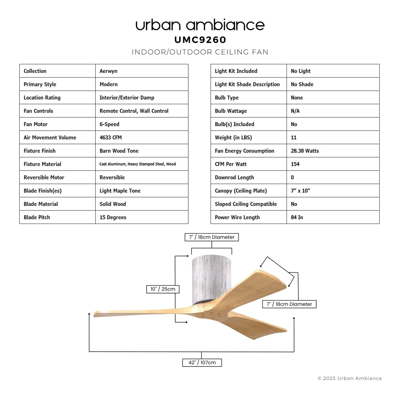 UMC9260 Modern Indoor/Outdoor Ceiling Fan, 10" H x 42" W x 42" D, Barn Wood Tone Finish, Aerwyn Collection