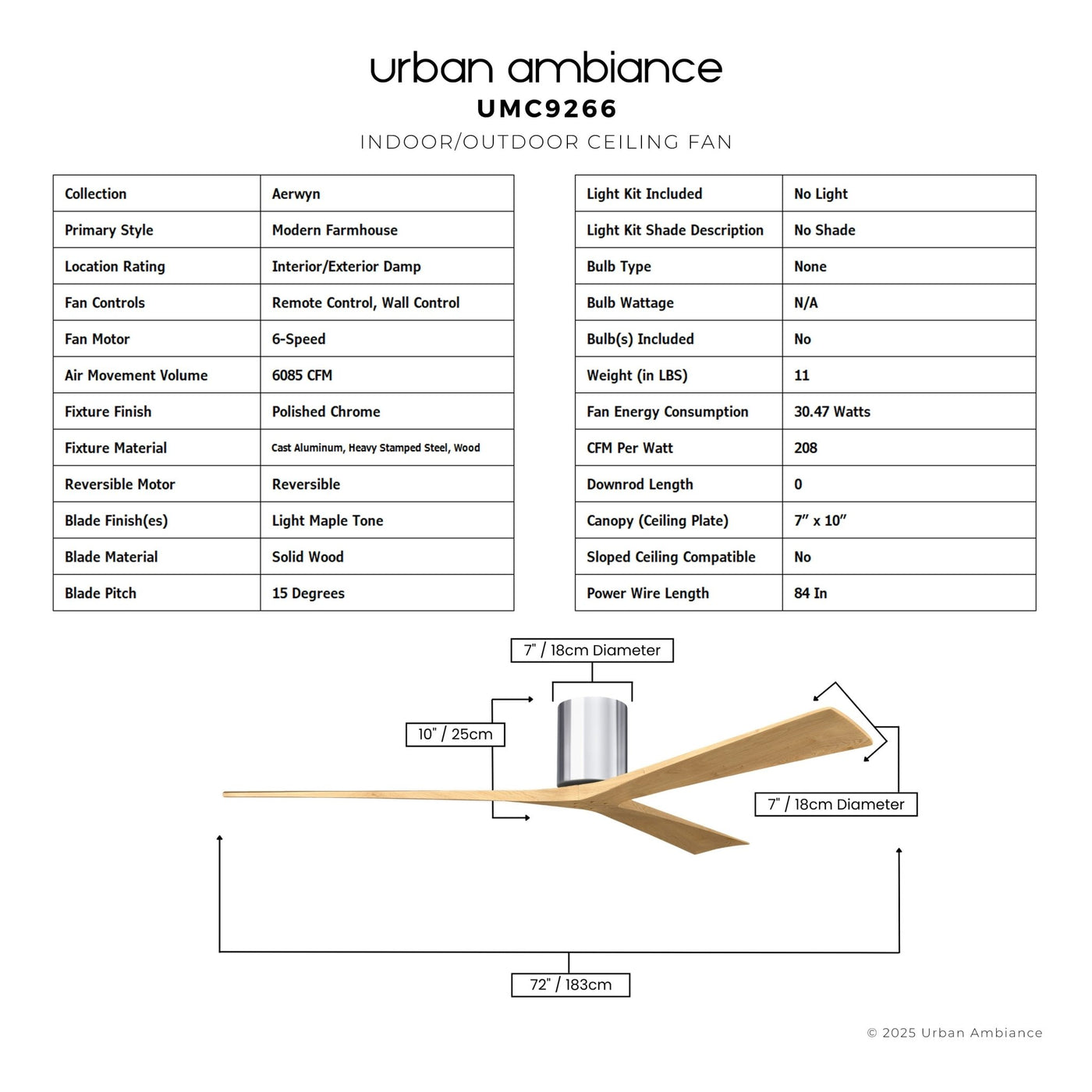 UMC9266 Modern Farmhouse Indoor/Outdoor Ceiling Fan, 10" H x 72" W x 72" D, Polished Chrome Finish, Aerwyn Collection
