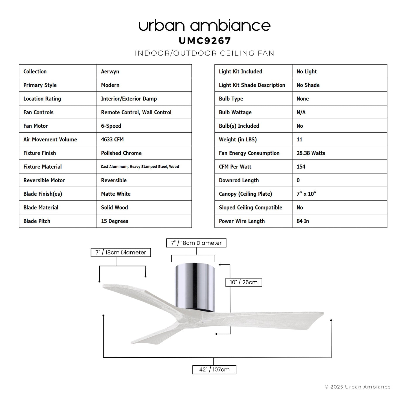 UMC9267 Modern Indoor/Outdoor Ceiling Fan, 10" H x 42" W x 42" D, Polished Chrome Finish, Aerwyn Collection