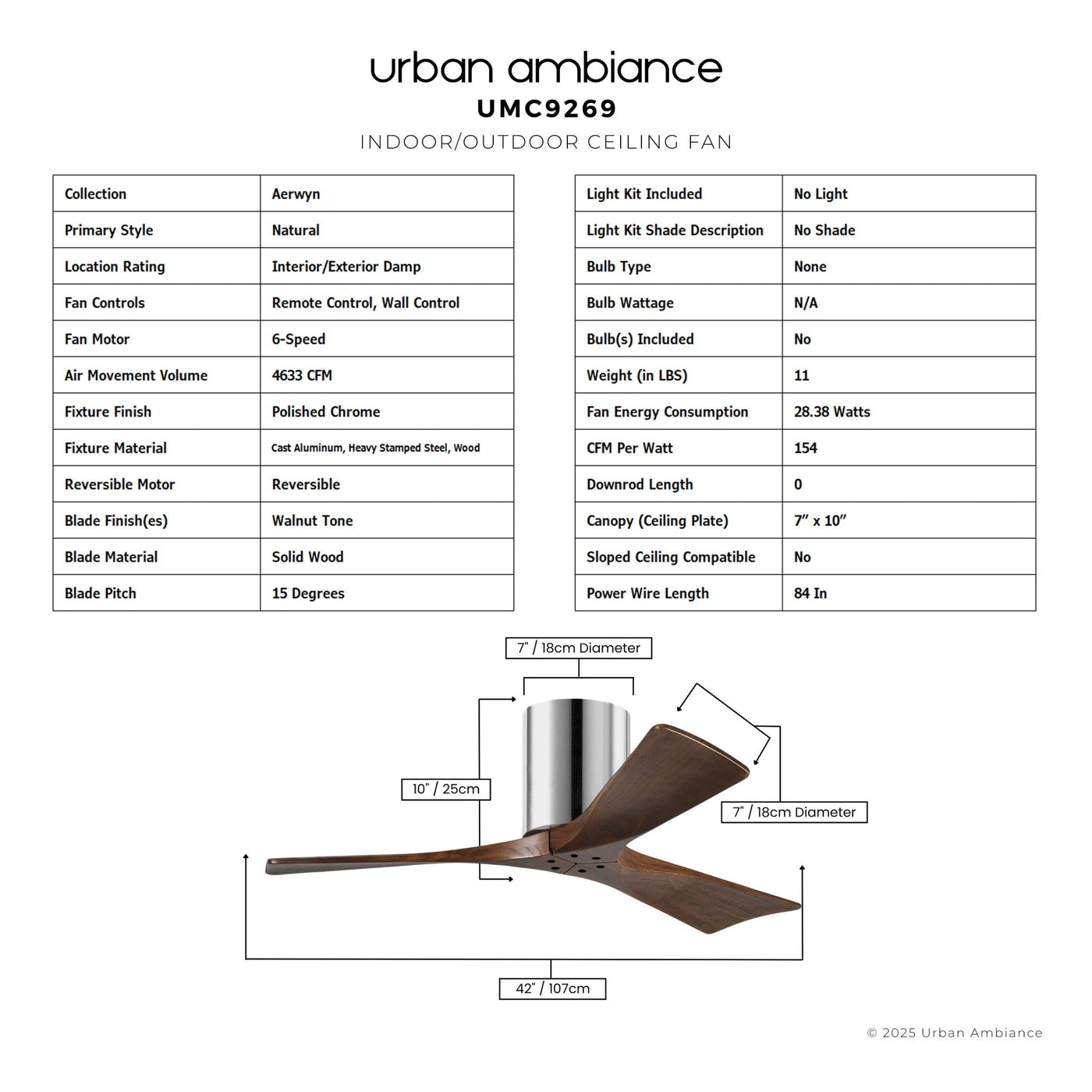 UMC9269 Natural Indoor/Outdoor Ceiling Fan, 10" H x 42" W x 42" D, Polished Chrome Finish, Aerwyn Collection