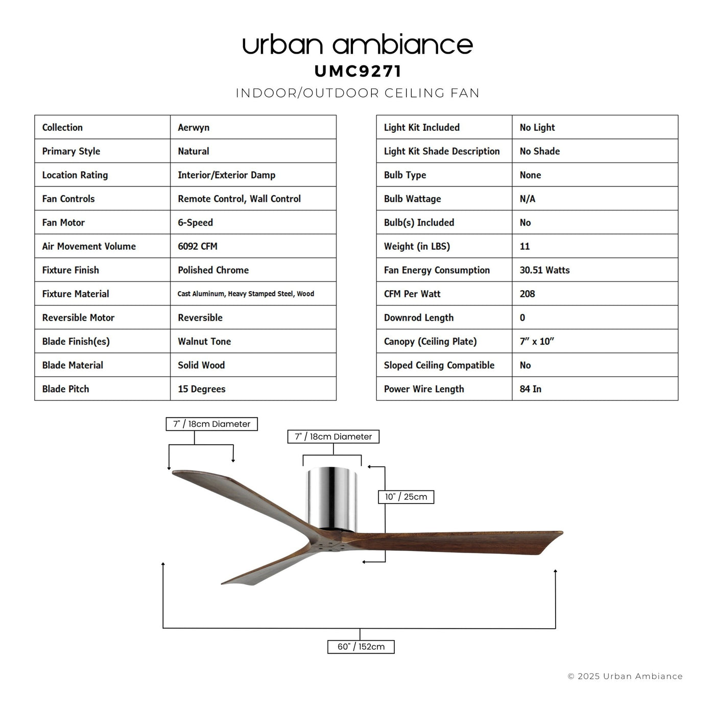 UMC9271 Natural Indoor/Outdoor Ceiling Fan, 10" H x 60" W x 60" D, Polished Chrome Finish, Aerwyn Collection