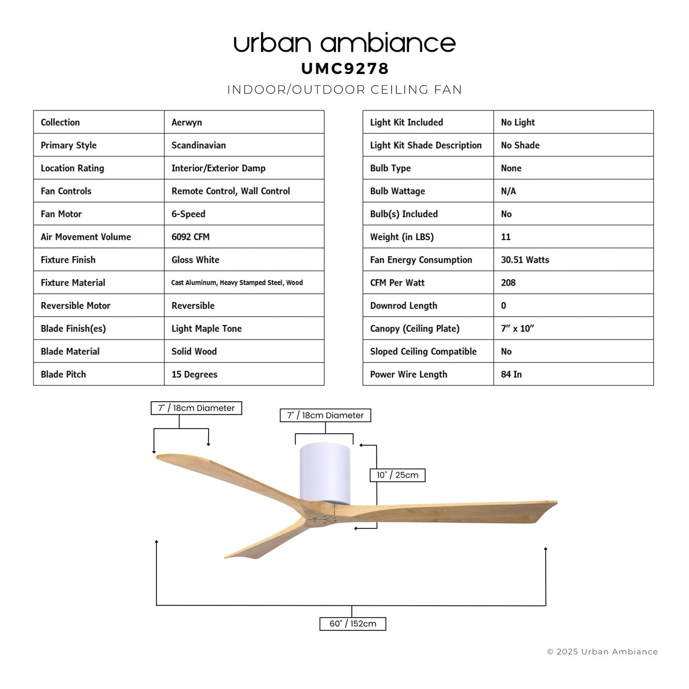 UMC9278 Scandinavian Indoor/Outdoor Ceiling Fan, 10" H x 60" W x 60" D, Gloss White Finish, Aerwyn Collection