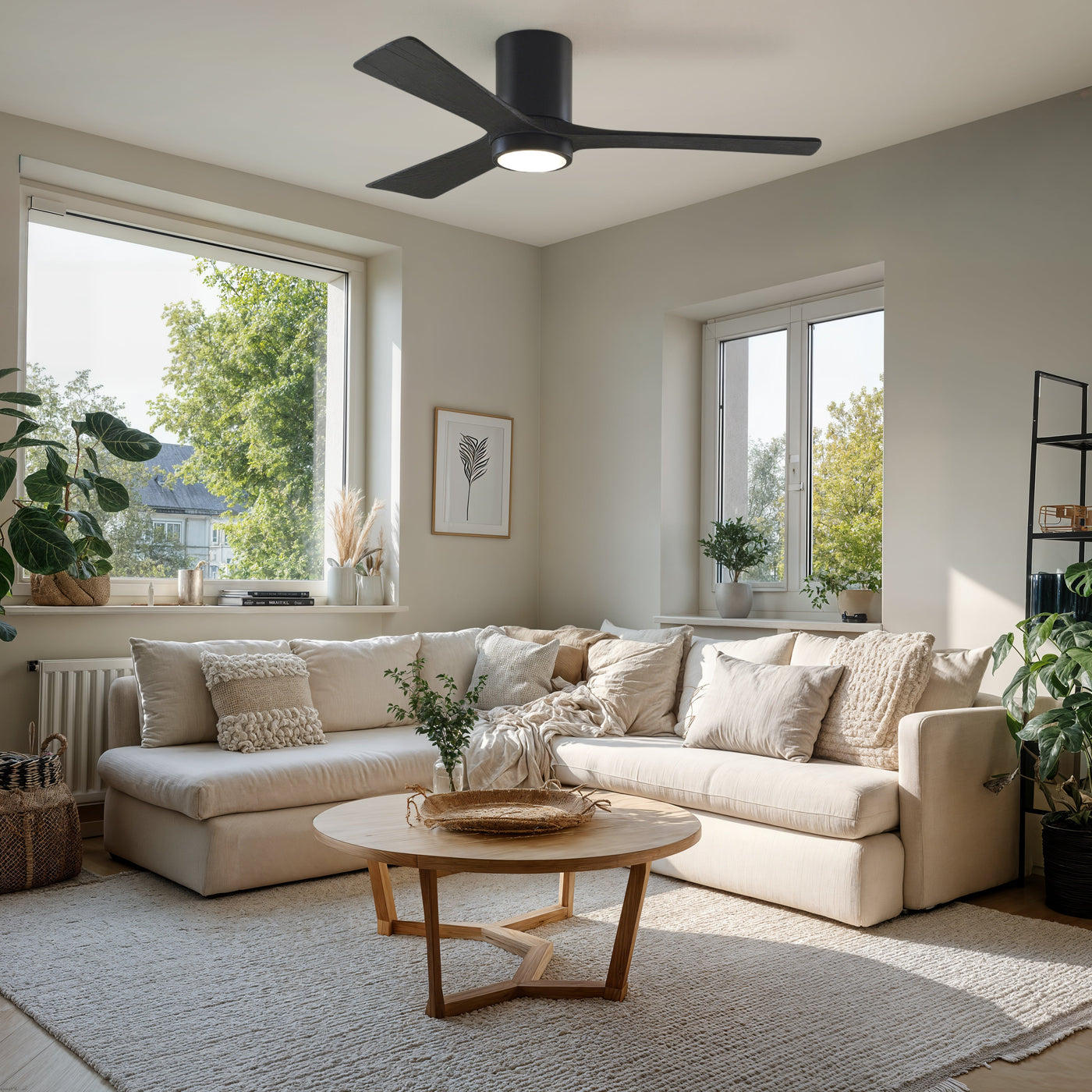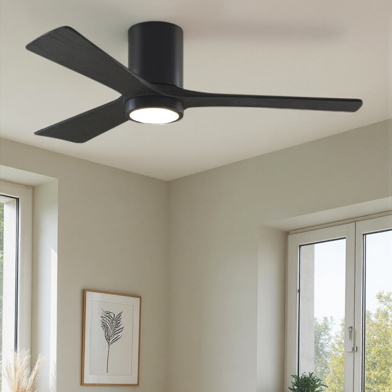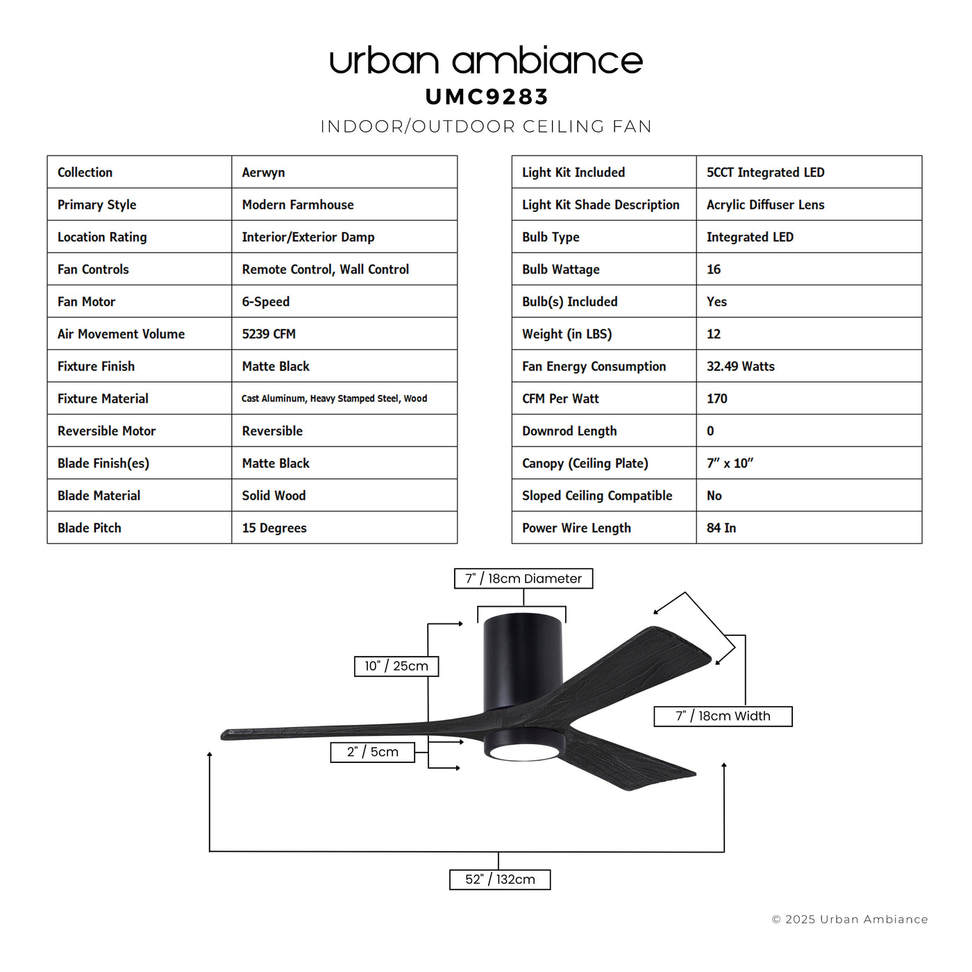 UMC9283 Modern Farmhouse Indoor/Outdoor Ceiling Fan, 12" H x 52" W x 52" D, Matte Black Finish, Aerwyn Collection
