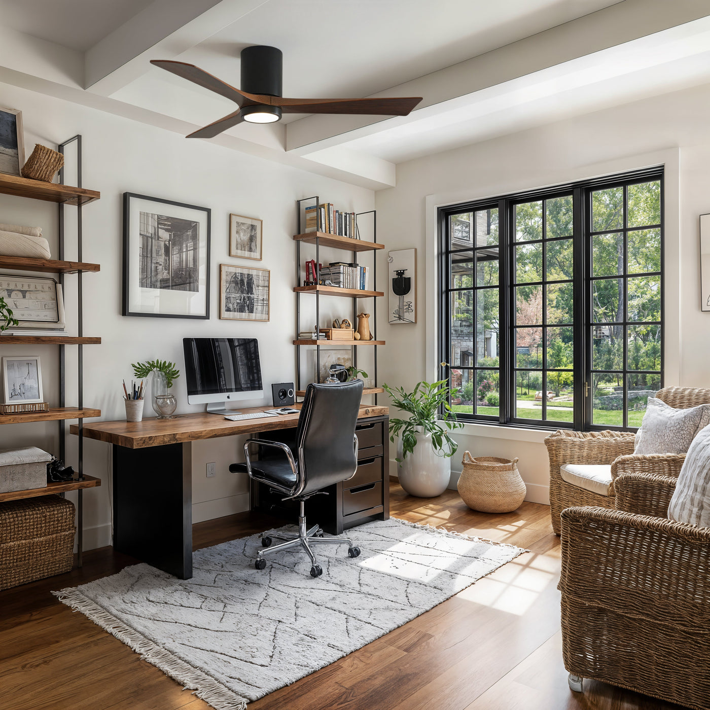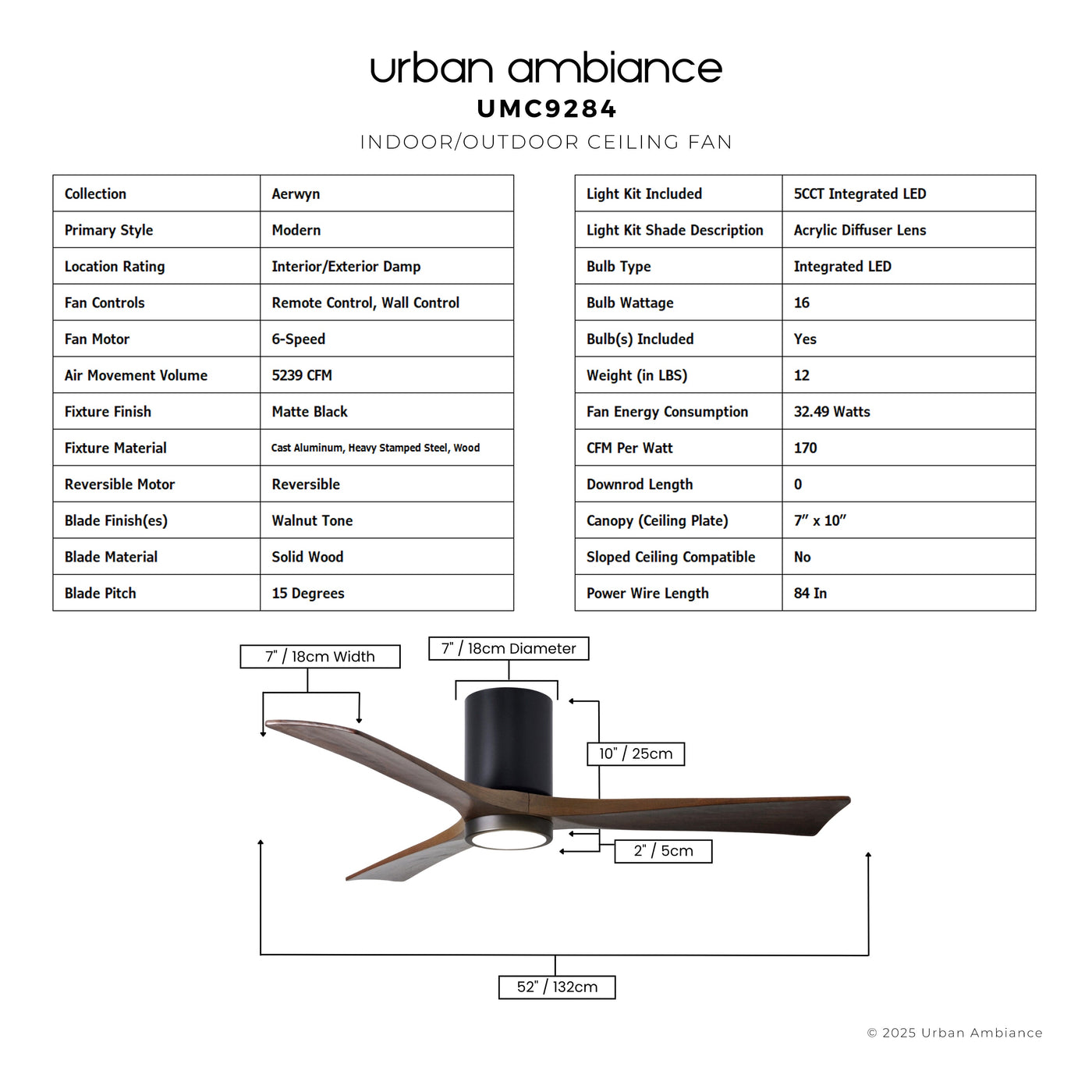 UMC9284 Modern Indoor/Outdoor Ceiling Fan, 12" H x 52" W x 52" D, Matte Black Finish, Aerwyn Collection