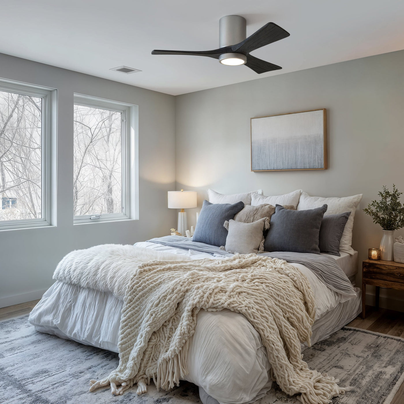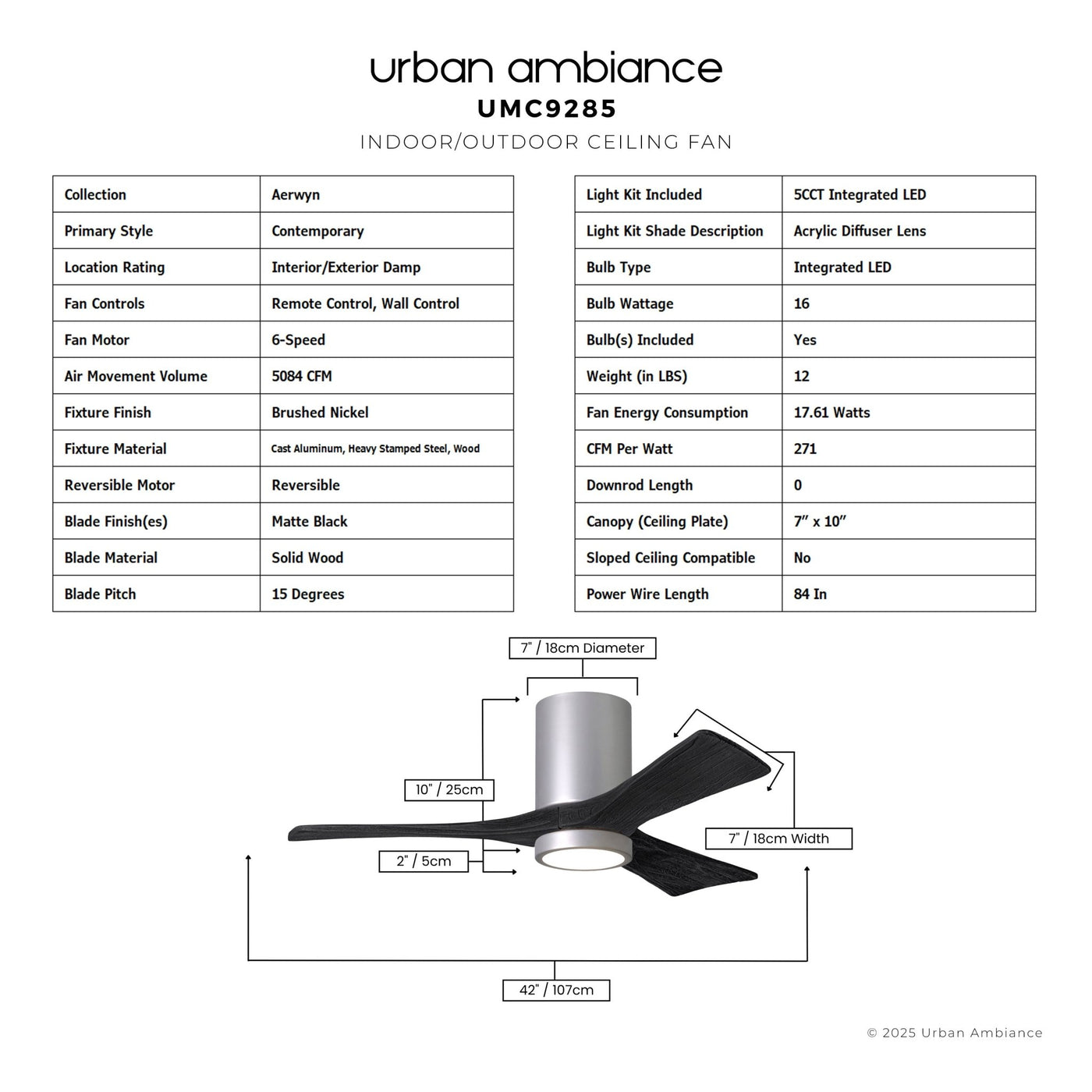 UMC9285 Contemporary Indoor/Outdoor Ceiling Fan, 12" H x 42" W x 42" D, Brushed Nickel Finish, Aerwyn Collection