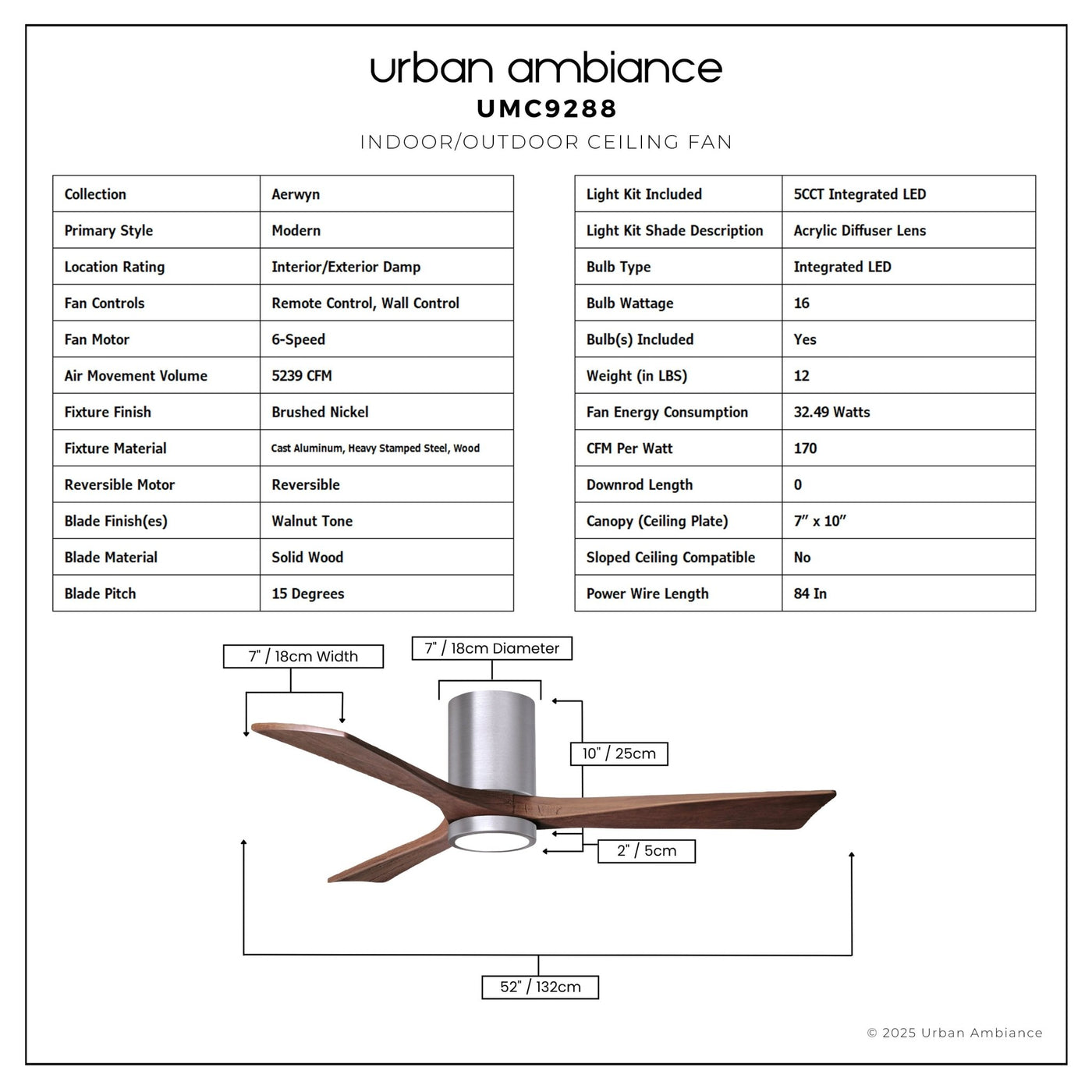 UMC9288 Modern Indoor/Outdoor Ceiling Fan, 12" H x 52" W x 52" D, Brushed Nickel Finish, Aerwyn Collection