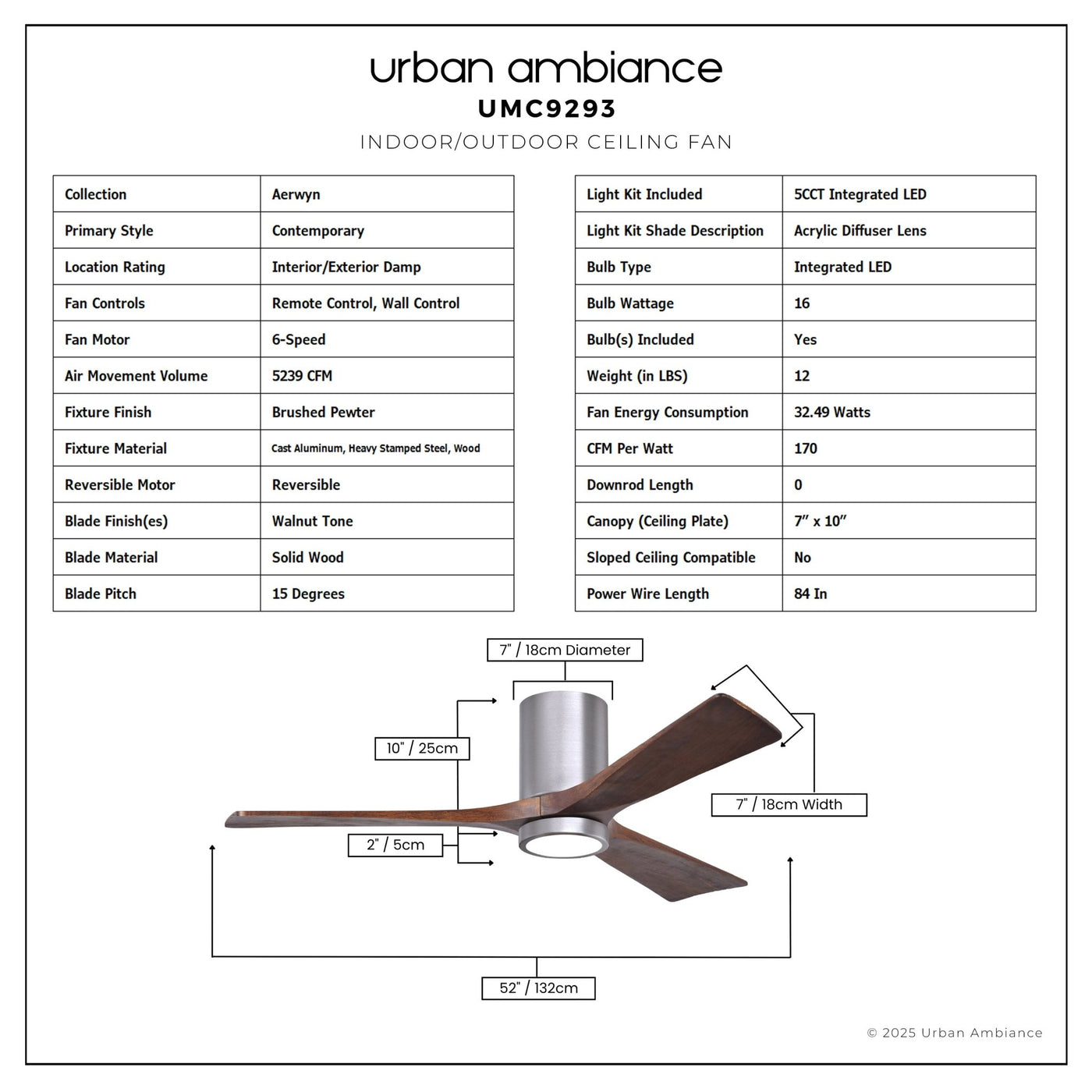 UMC9293 Contemporary Indoor/Outdoor Ceiling Fan, 12" H x 52" W x 52" D, Brushed Pewter Finish, Aerwyn Collection