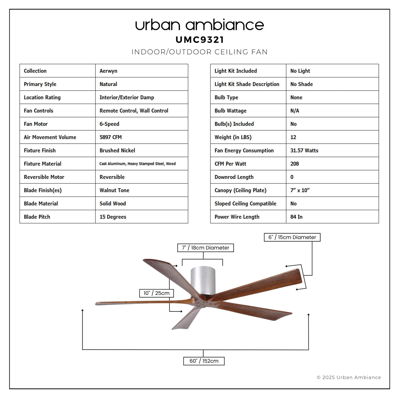 UMC9321 Natural Indoor/Outdoor Ceiling Fan, 10" H x 60" W x 60" D, Brushed Nickel Finish, Aerwyn Collection