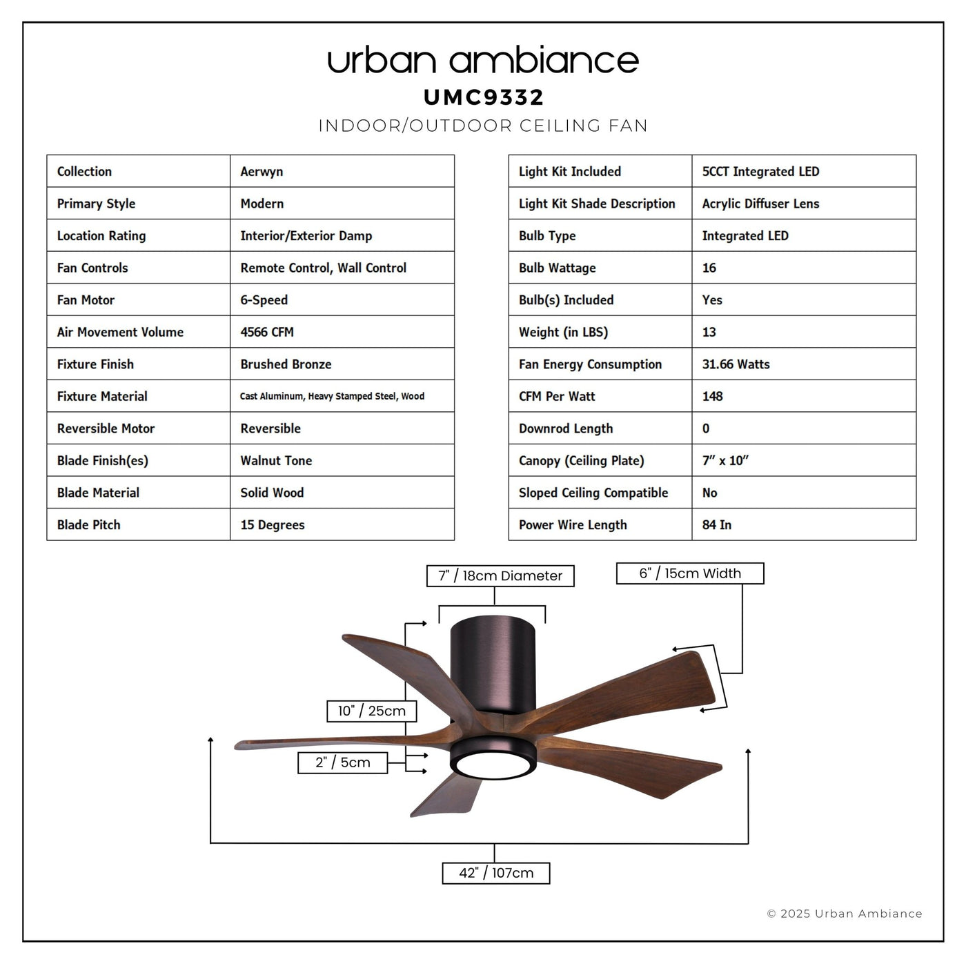 UMC9332 Modern Indoor/Outdoor Ceiling Fan, 12" H x 42" W x 42" D, Brushed Bronze Finish, Aerwyn Collection