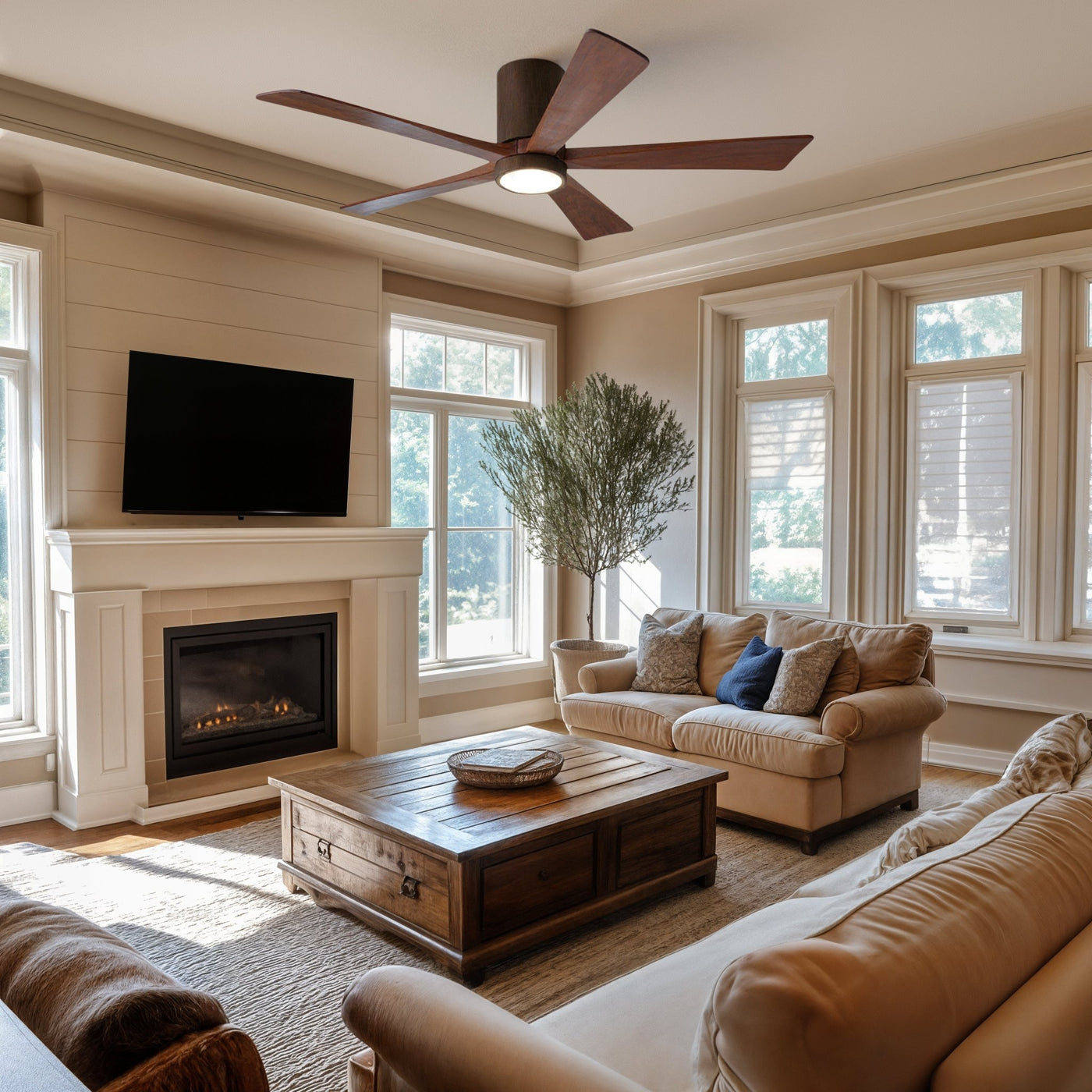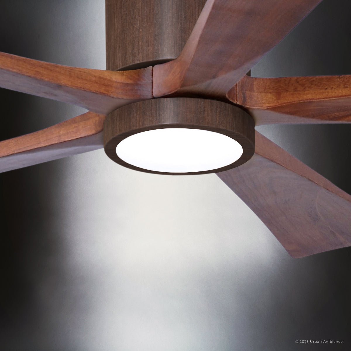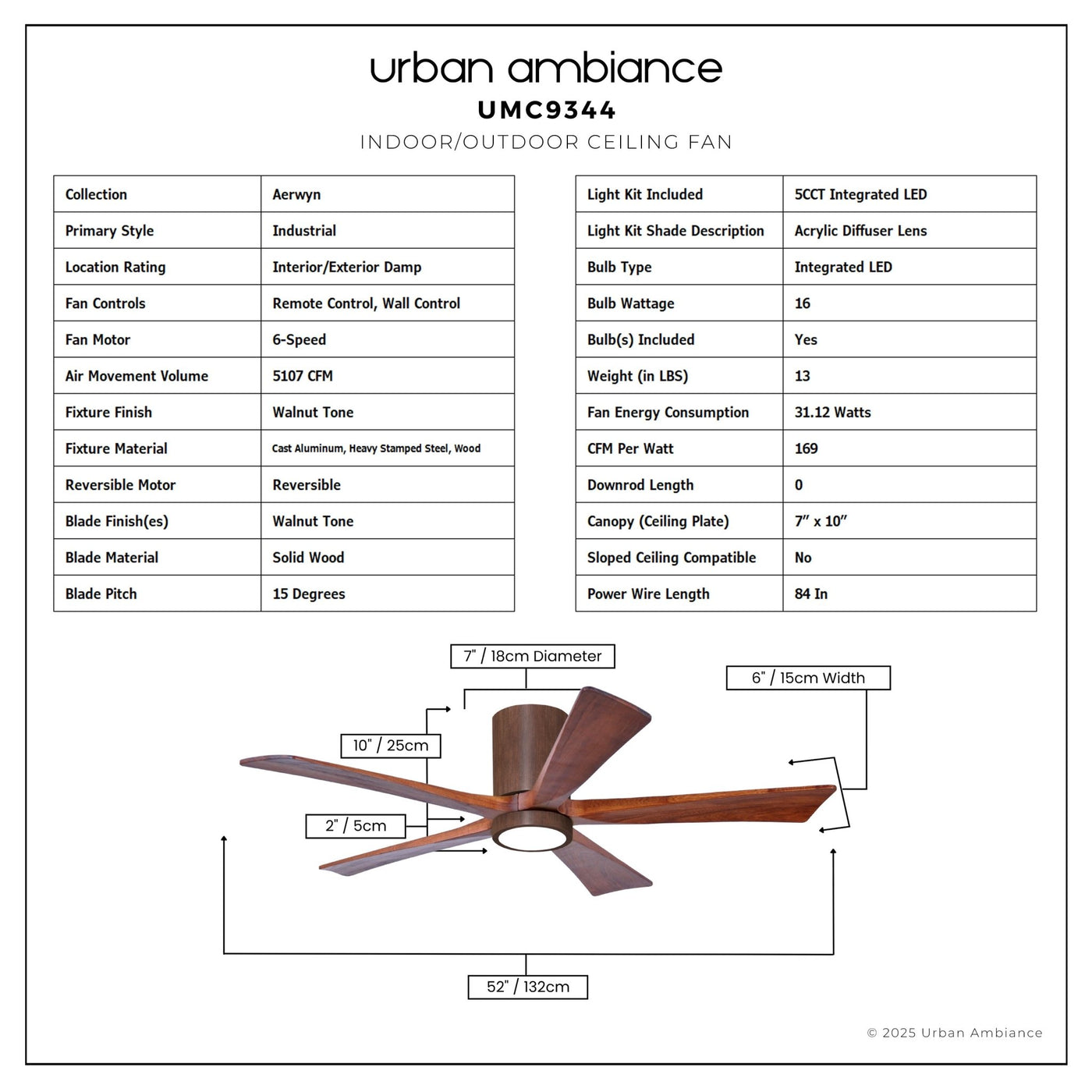 UMC9344 Industrial Indoor/Outdoor Ceiling Fan, 12" H x 52" W x 52" D, Walnut Tone Finish, Aerwyn Collection