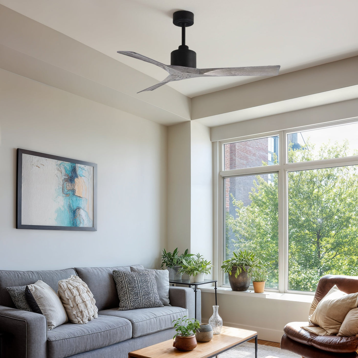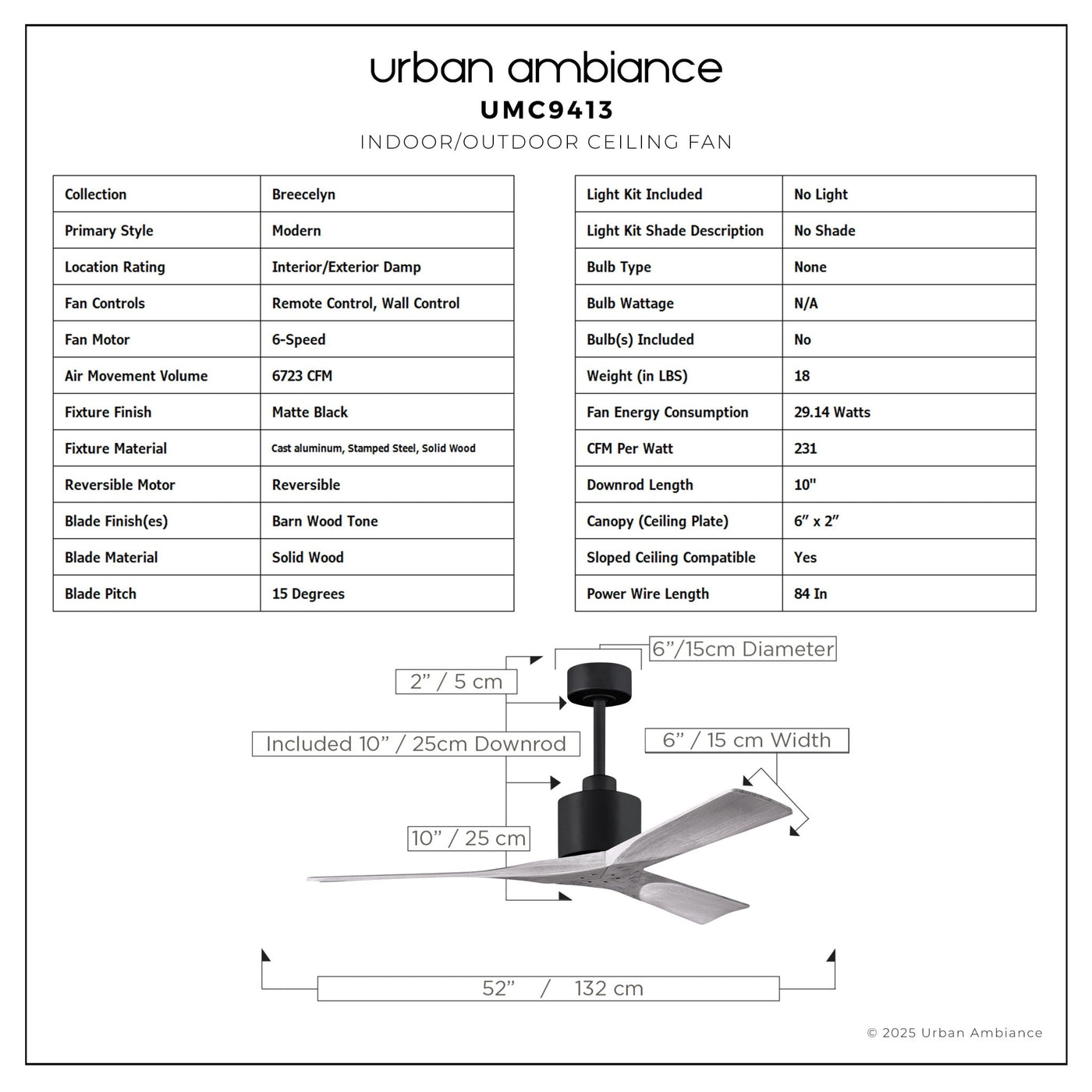 UMC9413 Modern Indoor/Outdoor Ceiling Fan, 12" (Plus Downrod) H x 52" W x 52" D, Matte Black Finish, Breecelyn Collection