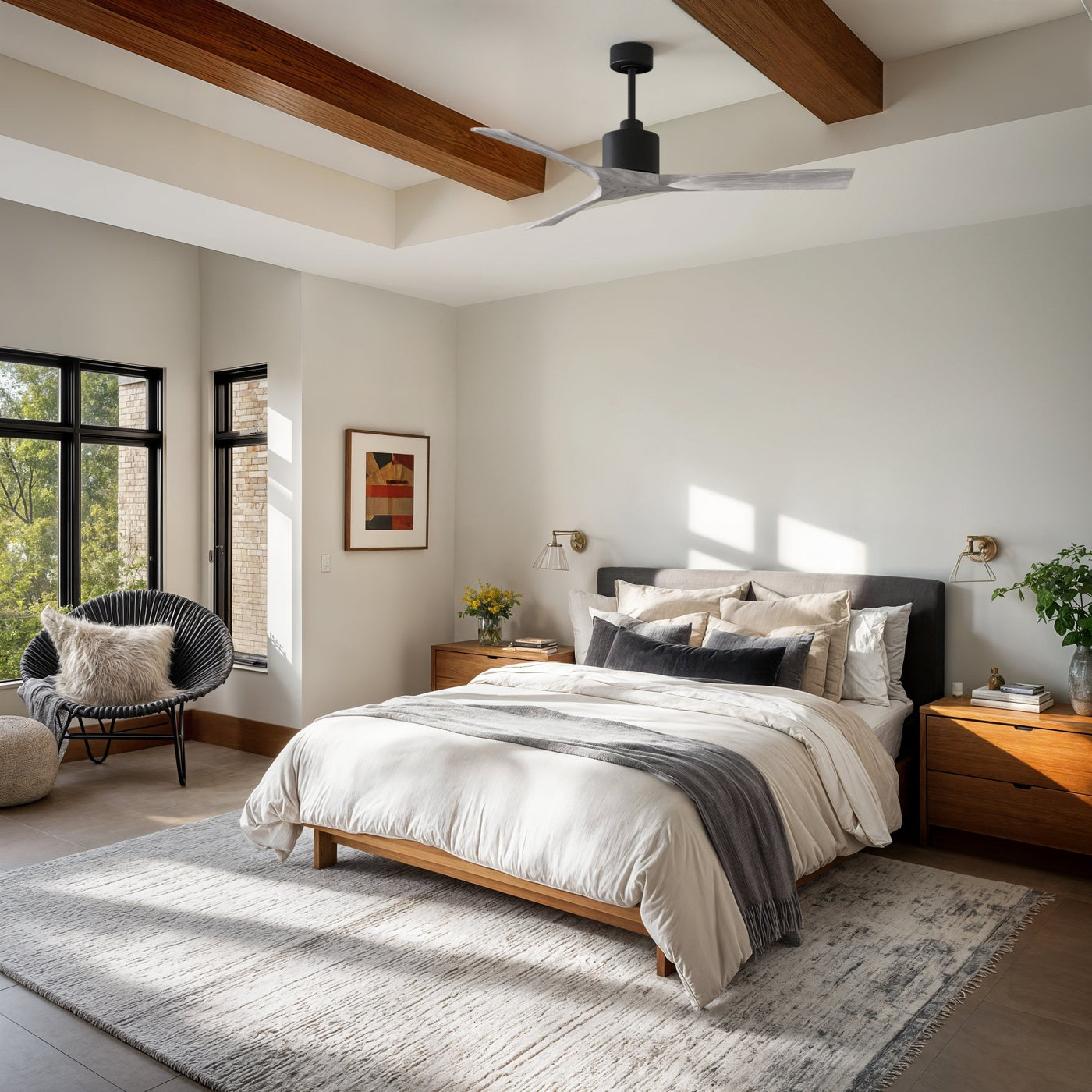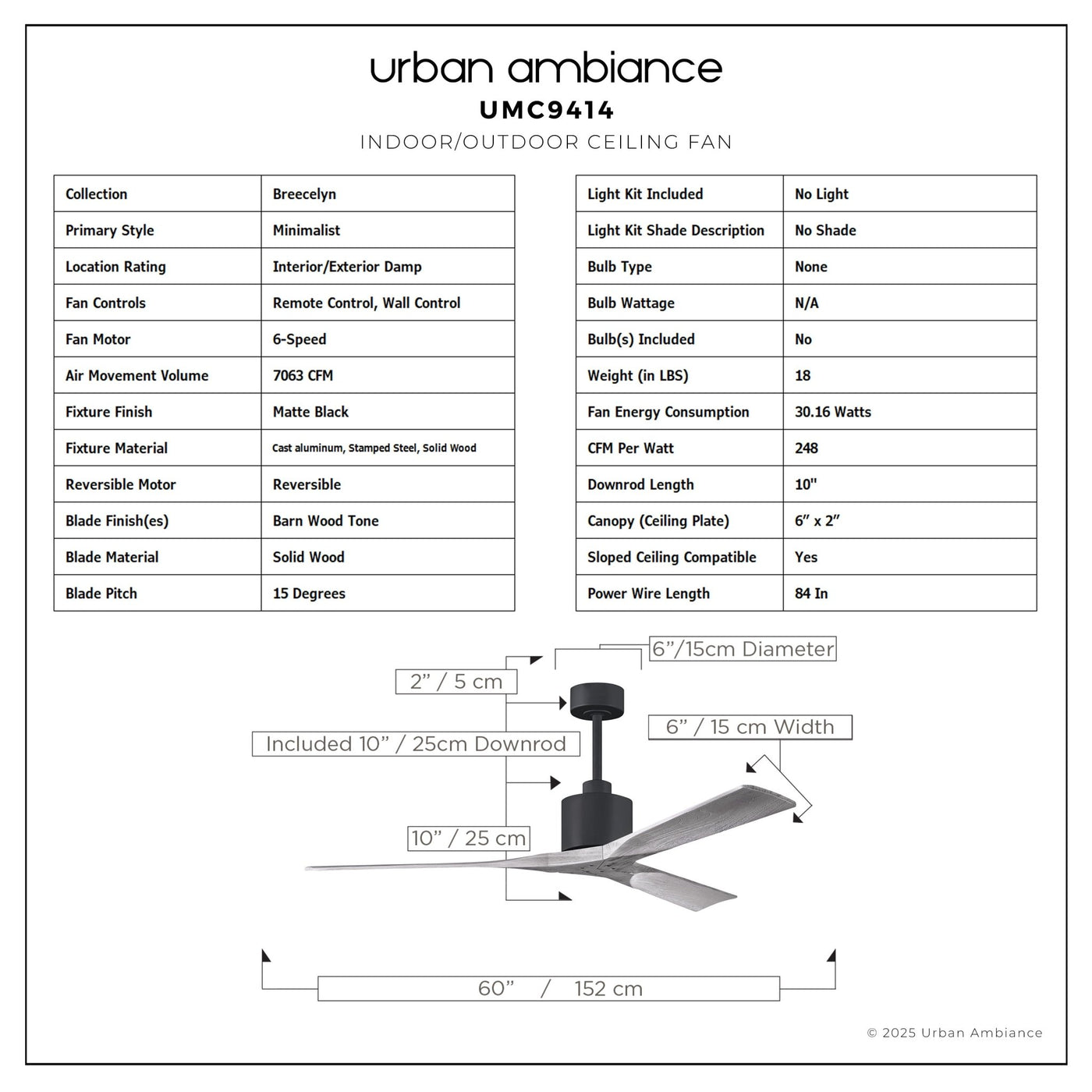 UMC9414 Minimalist Indoor/Outdoor Ceiling Fan, 12" (Plus Downrod) H x 60" W x 60" D, Matte Black Finish, Breecelyn Collection